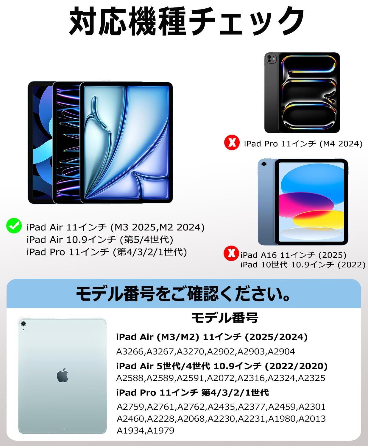 【対応機種&安心】iPad Air (M3) 11インチ (2025モデル:A3266 /A3267/A3270)、iPad Air (M2) 11インチ(2024モデル:A2902/A2903/A2904)、iPad Air 第5世代 10.9インチ (2022モデル:A2588/A2589/A2591)、iPad Air 第4世代 10.9インチ (2020モデル:A2316/A2324/A2325/A2072)、iPad Pro 11インチ 第4世代 (2022モデル:A2759/A2435/A2761/A2762)、iPad Pro 11インチ 第3世代 (2021モデル:A2377/A2459/A2301/A2460)、iPad Pro 11インチ 第2世代(2020モデル:A2228/A2068/A2230/A2231)、iPad Pro 11インチ 第1世代(2018モデル:A1980/A2013/A1934/A1979)。ご注文から1年間の安心が付き、商品には何か不具合がございましたら、お気軽に弊店にご連絡くださいませ。至急対応させていただきます。