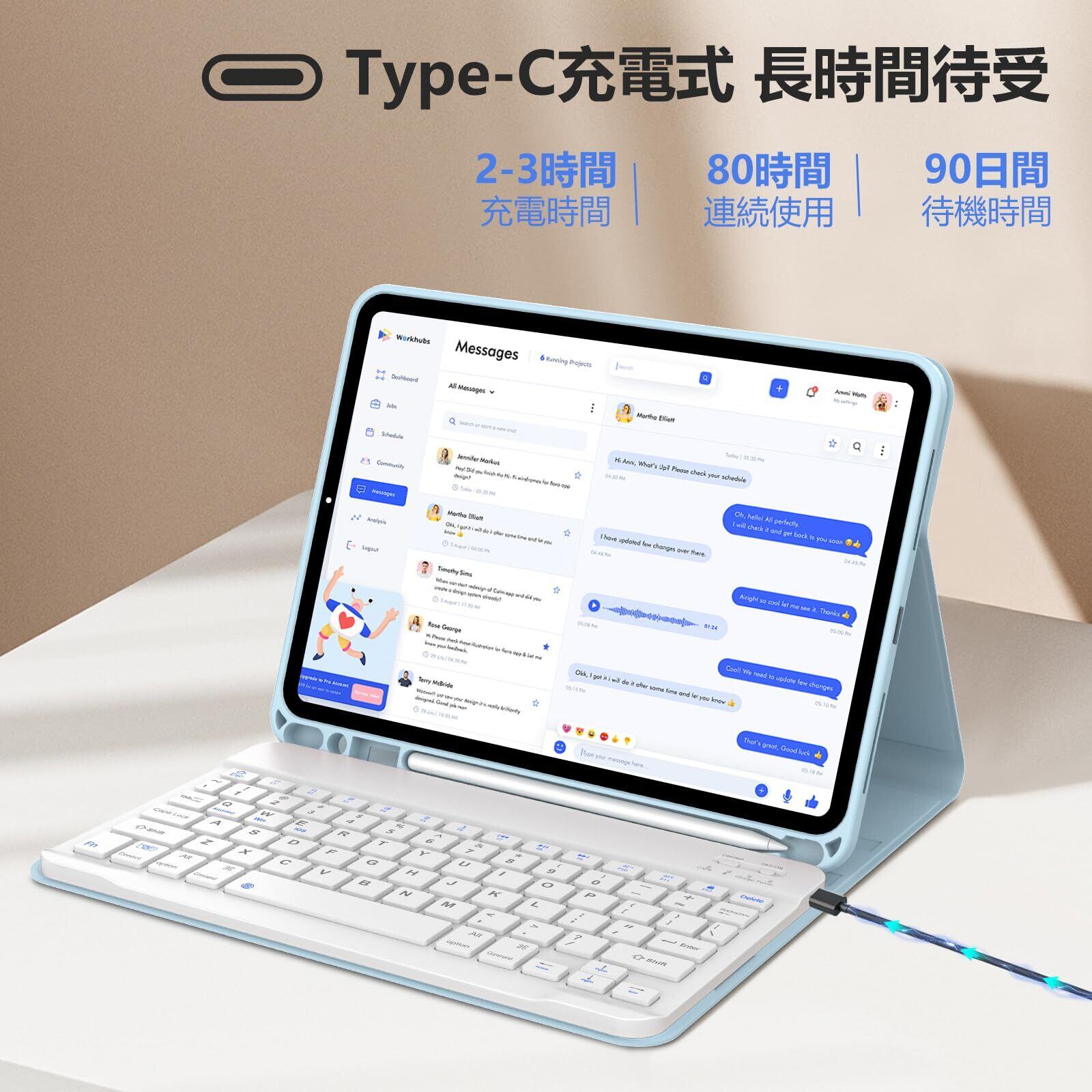 【省電力設計&長時間バッテリー】ipad air4 キーボード ケースにオートスリープ機能が搭載し、カバーの開け閉めに応じて、瞬時にiPadの電源オン・オフになり、バッテリー消費を軽減します。iPad Pro 11インチ キーボードはType-C充電式で、2-3時間でフル充電後、日常程度(1日2時間使用)の場合には80時間の連続使用と90日のスタンバイができます。出張や旅行中もバッテリー切れの心配がありません。