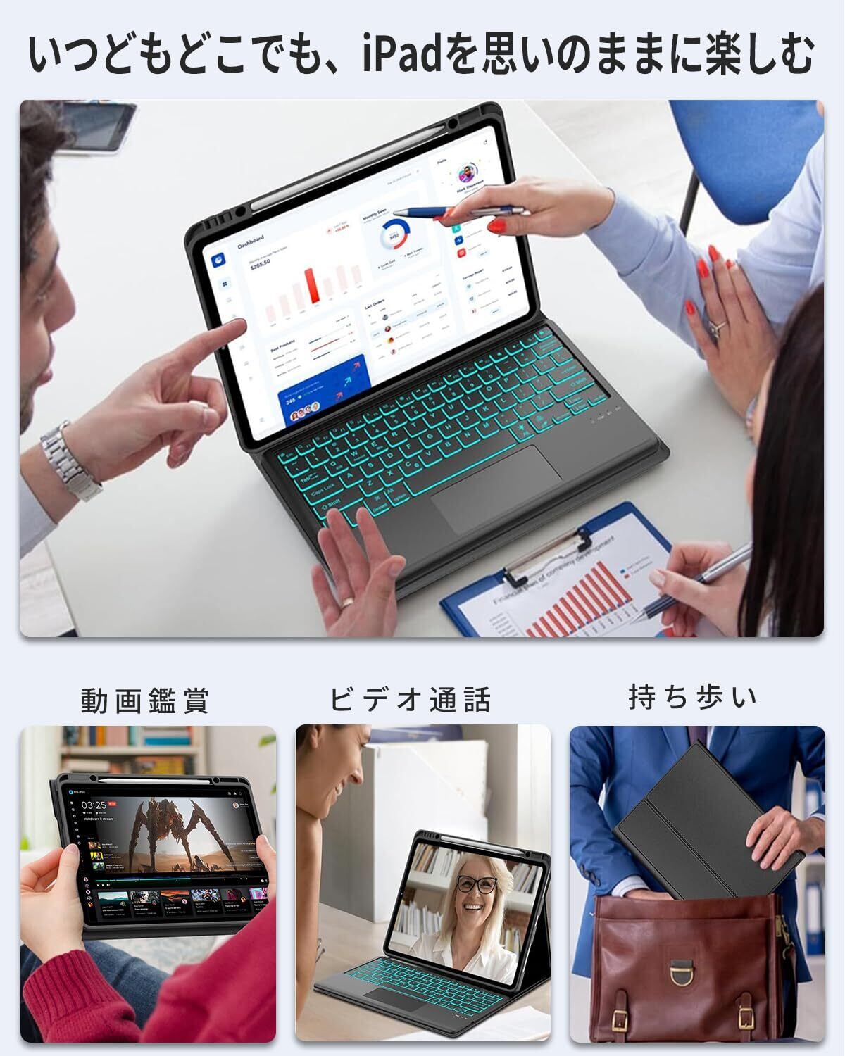 【着脱式デザイン・多様なシーン対応】iPad用 キーボードと保護ケースは強力なマグネットにより簡単に取り外し可能、タッピング時はノートPCモードに、読書時はケースノードに、動画鑑賞時はスタンドモードになり、用途に合わせて自由に変更できます。さらに、スタンド角度は3段階に調整可能、いつでも最適な視野角で快適に仕事やエンタメに楽しめます。