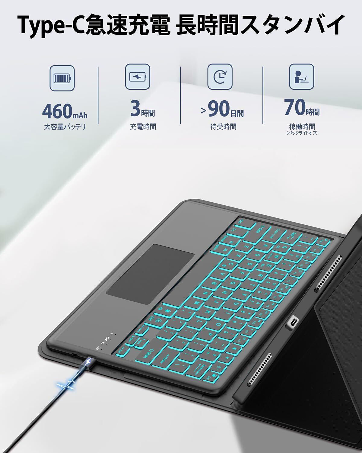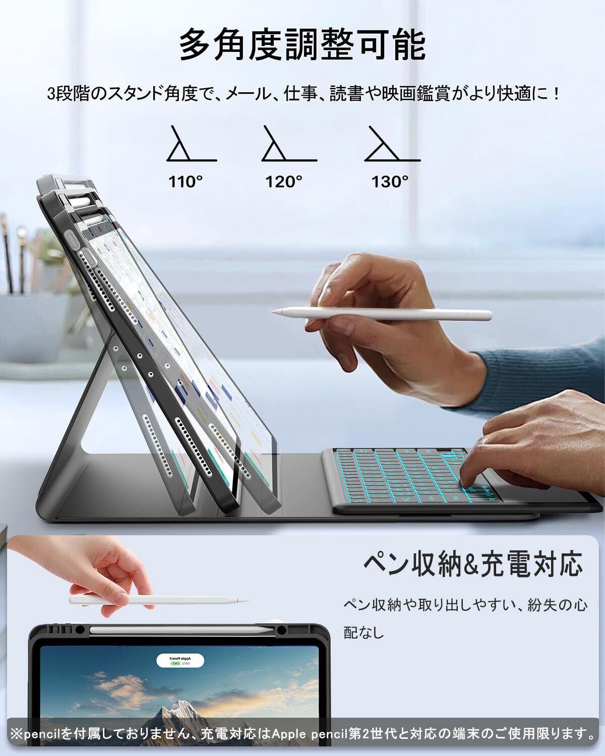 【7色バックライト&長時間スタンバイ】2025 ipad air m3 13インチ ケース キーボードはバックライト機能(7色と3段階輝度)が備えて、暗い場所でも快適に作業できます。心地よい打鍵感のシザーフット構造を採用、静かで軽やかにタッピングできます。大容量のバッテリーを内蔵し、満電なら80時間の連続使用と90日のスタンバイが可能、出張や旅行中に電池切れの心配がありません。