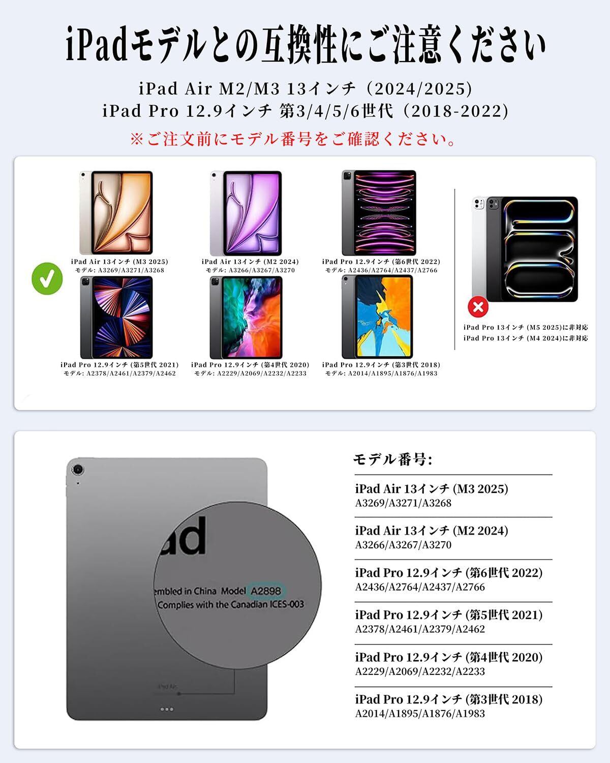 【対応機種&1年間品質】 このiPad キーボード付きケースは2025年最新のiPad Air (M3) 13インチ、2024年のiPad Air (M2) 13インチ及びiPad Pro 12.9インチ (第6世代 / 第5世代 / 第4世代 / 第3世代)に対応します。他のモデルが非対応なので、ご注文前に、お手元のiPadモデル番号をご確認ください。の商品にはご購入日から1年間の品質があり、商品について何かご不明な点がございましたら、ご遠慮なくお問合わせてください。