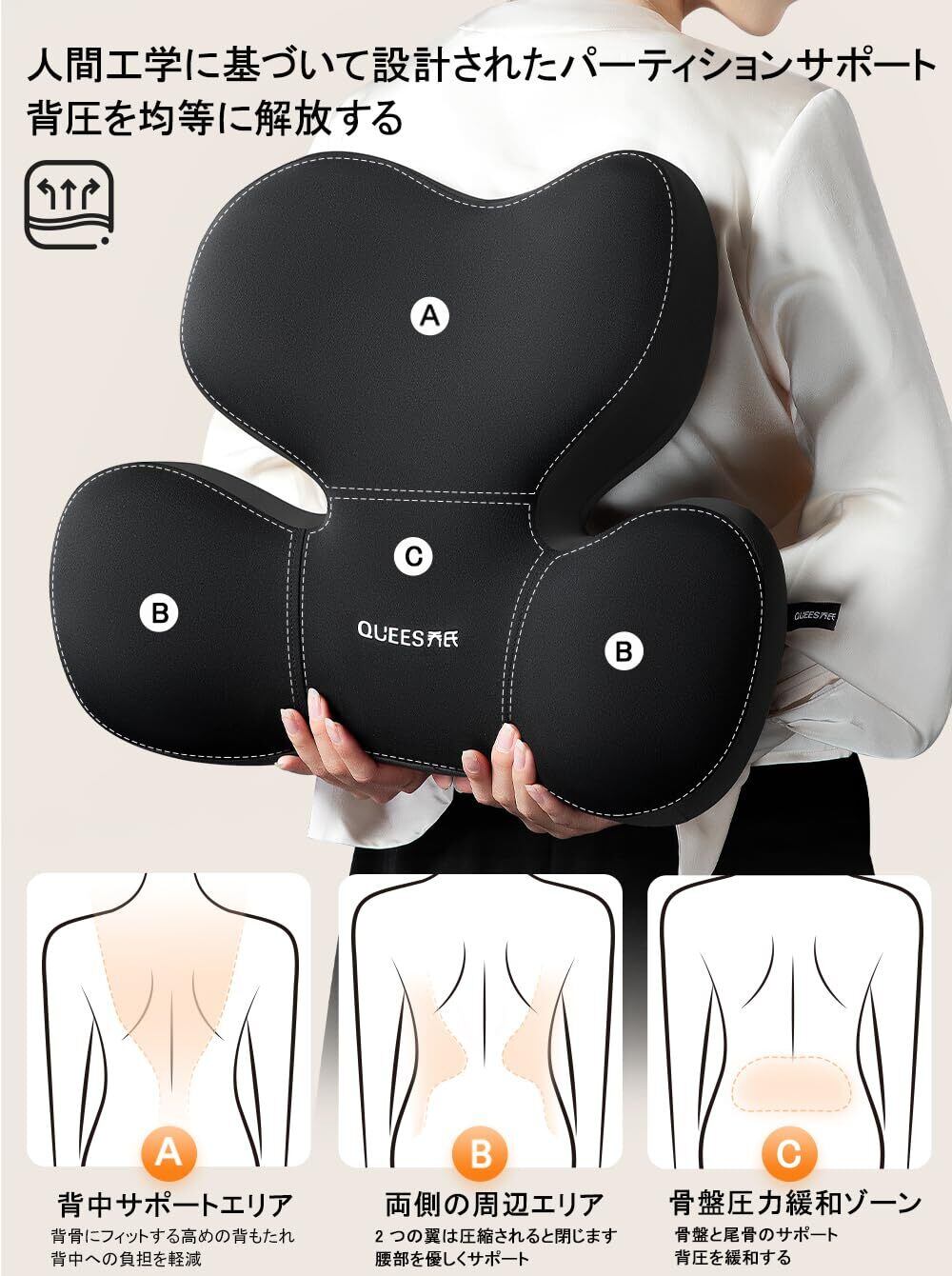 【独占デザイン】腰部クッションは人間工学に基づいたU字型カーブデザインを採用しています。採用したドイツ輸入のメモリーコットンは体のカーブとぴったりフィットできて、座面と背もたれの隙間を埋め、両側から腰を包み込んで支え、正しい座り姿勢を実現します。このランバーサポートにより、痛みに悩むドライバーも快適に運転できます。