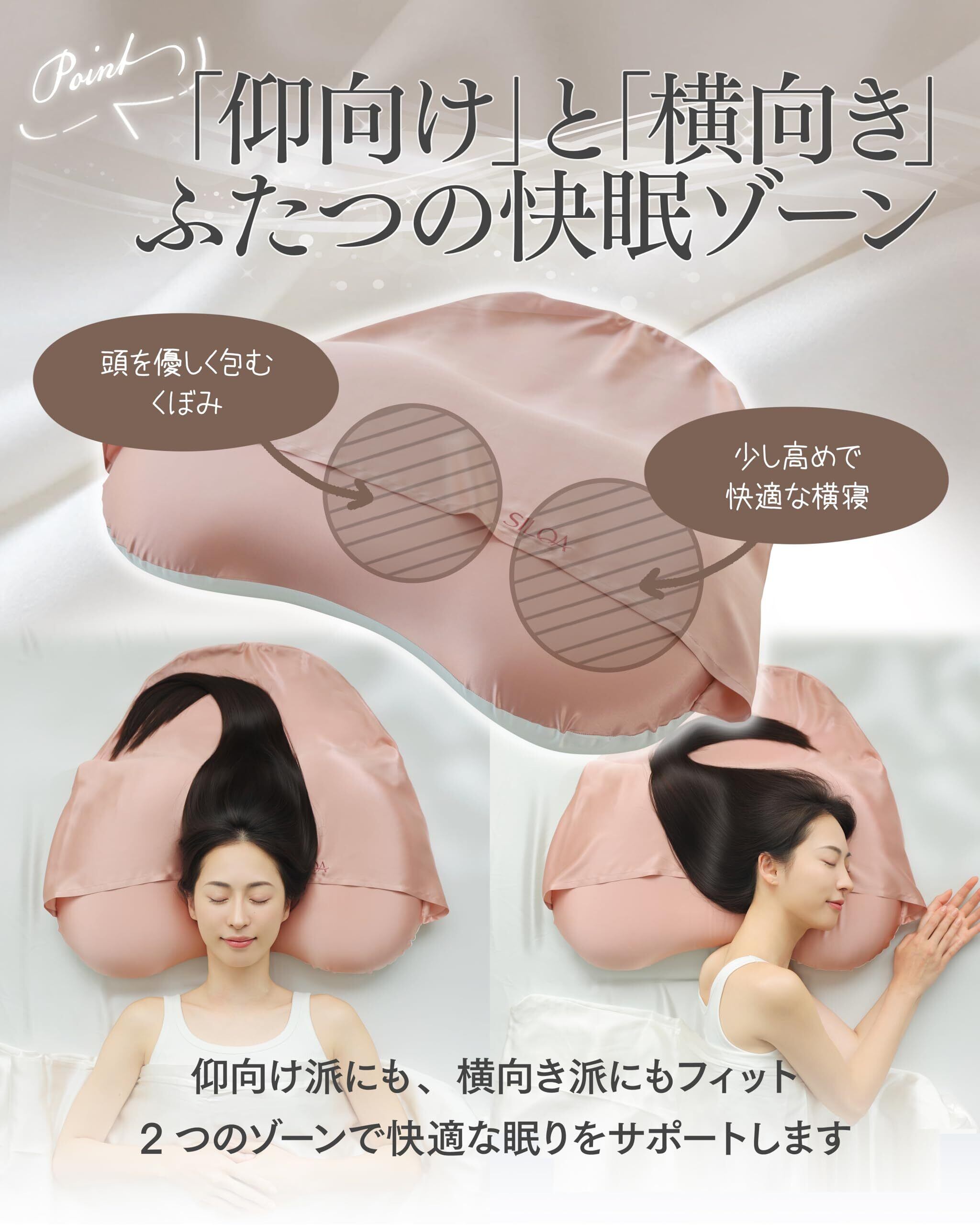 【摩擦を抑える】寝返りによる摩擦ダメージを軽減する、つるつるすべすべのシルク枕カバーを採用。
