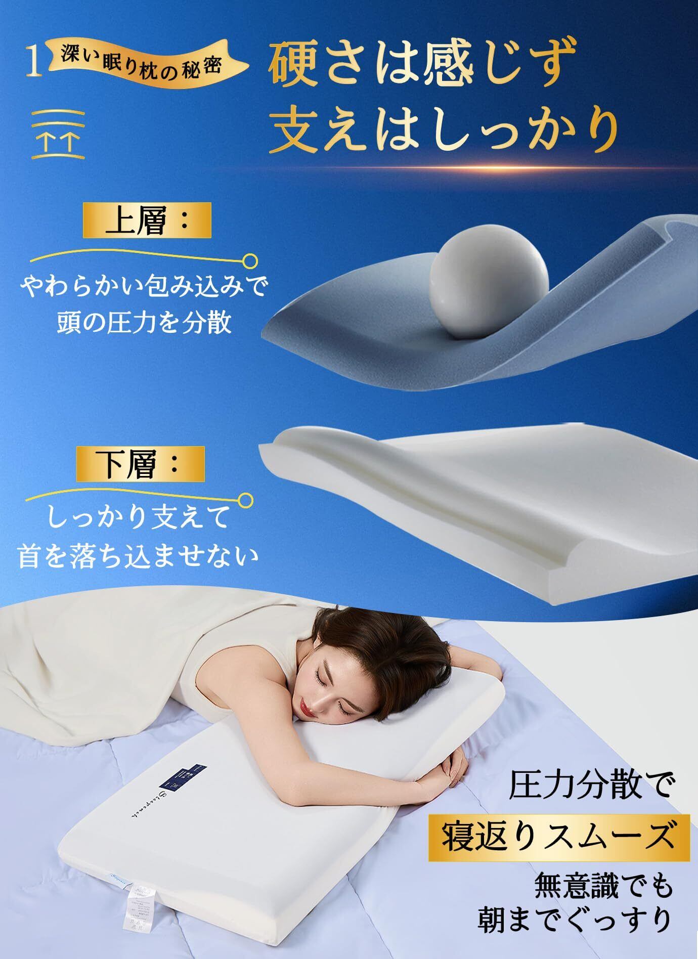 【深睡眠を、すぐそばに。】【どんな寝姿勢でもしっかりサポート】ゆったりとしたサイズの枕は、仰向け寝はもちろん、横向き寝やうつ伏せ寝にも対応。首や肩への負担を軽減し、自然な首のカーブをやさしく支えます。この低反発枕は、圧力を分散し、首を心地よくサポートします。