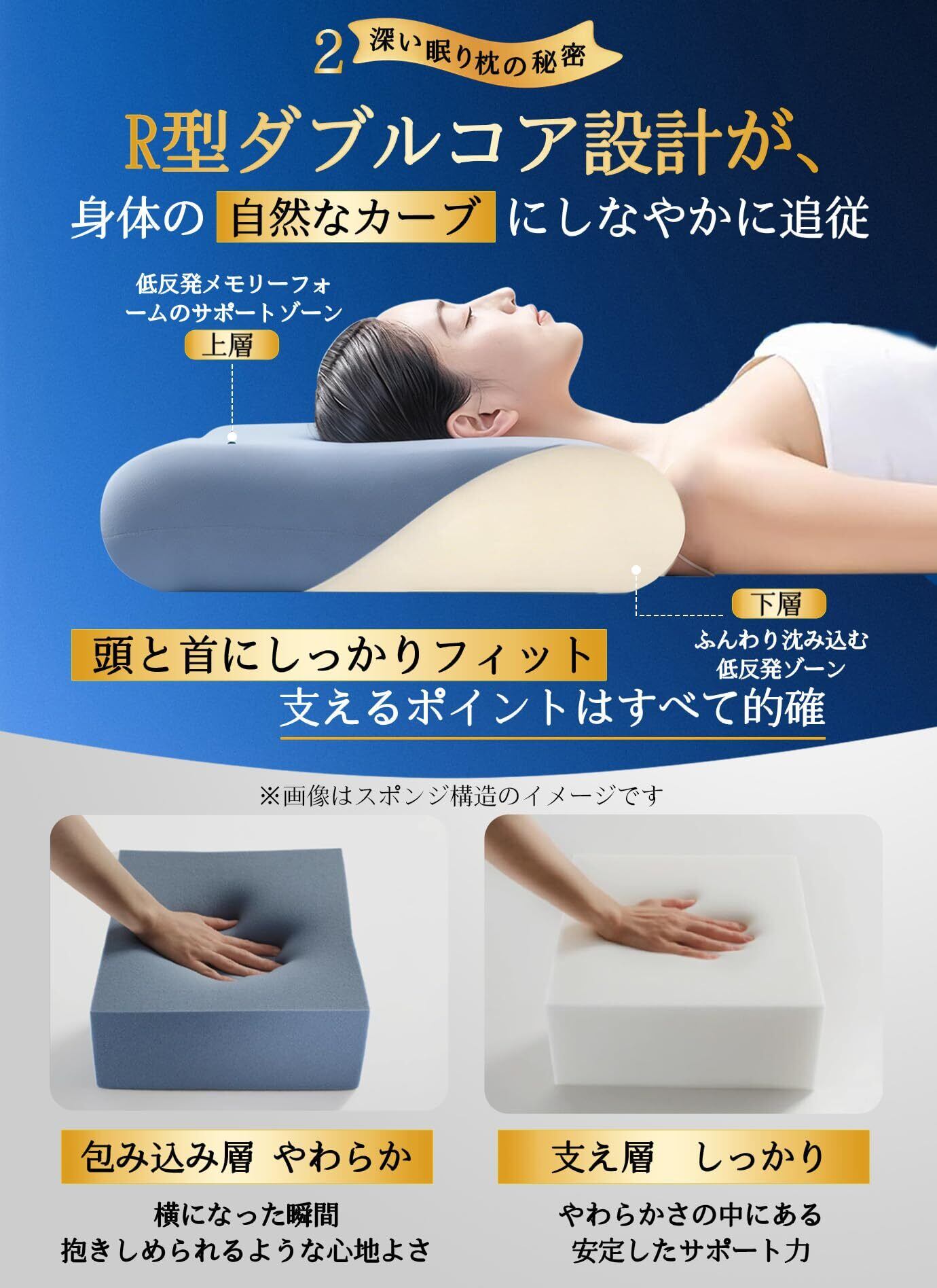 【枕材2層構造で理想の寝心地を実現。柔らかさと支えのバランスが創り出す、全新の睡眠体験。】枕材は2層構造で、柔らかさとしっかりとしたサポート力を兼ね備え、体のラインに心地よくフィット。体圧を均等に分散し、首や肩への負担を軽減します。