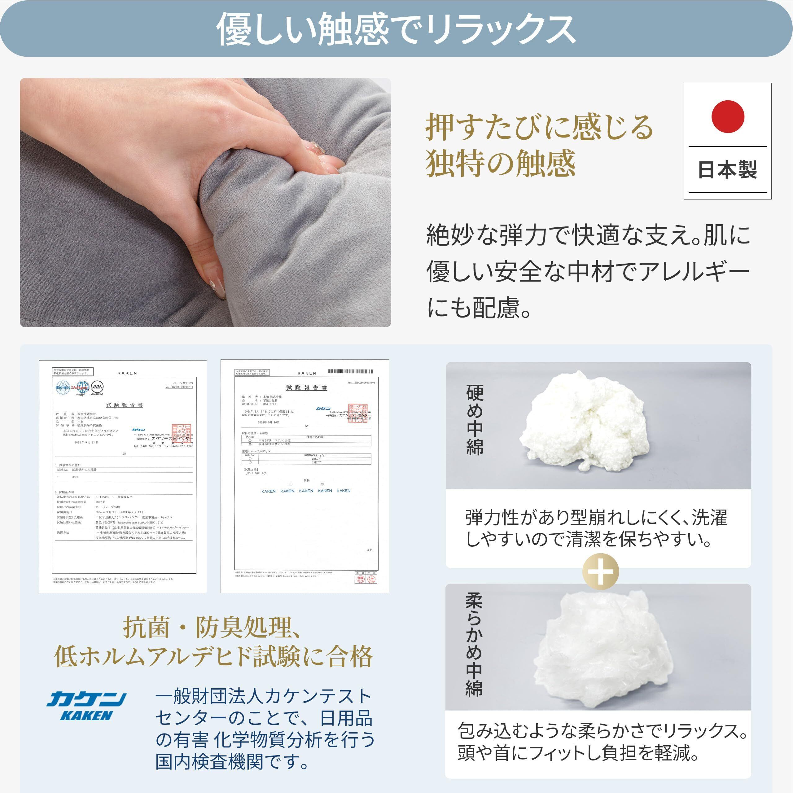 【安心の日本製&高品質素材】 低アレルギー・通気性抜群の中綿使用。敏感肌・お子様にも安心。抗菌防臭加工でいつでも清潔。
