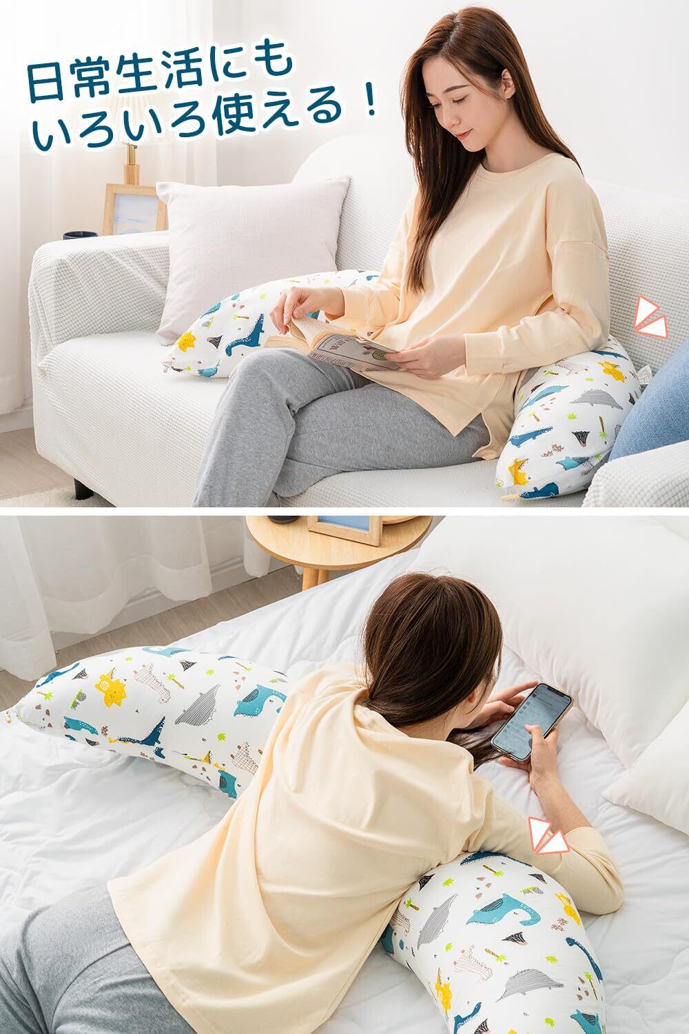 抱き枕 だきまくら 妊婦 授乳クッション 妊娠 マタニティ 補充綿200g付き 横向きに寝やすい 綿素材カバー 洗える 妊娠祝い 三日月型 白 恐竜柄