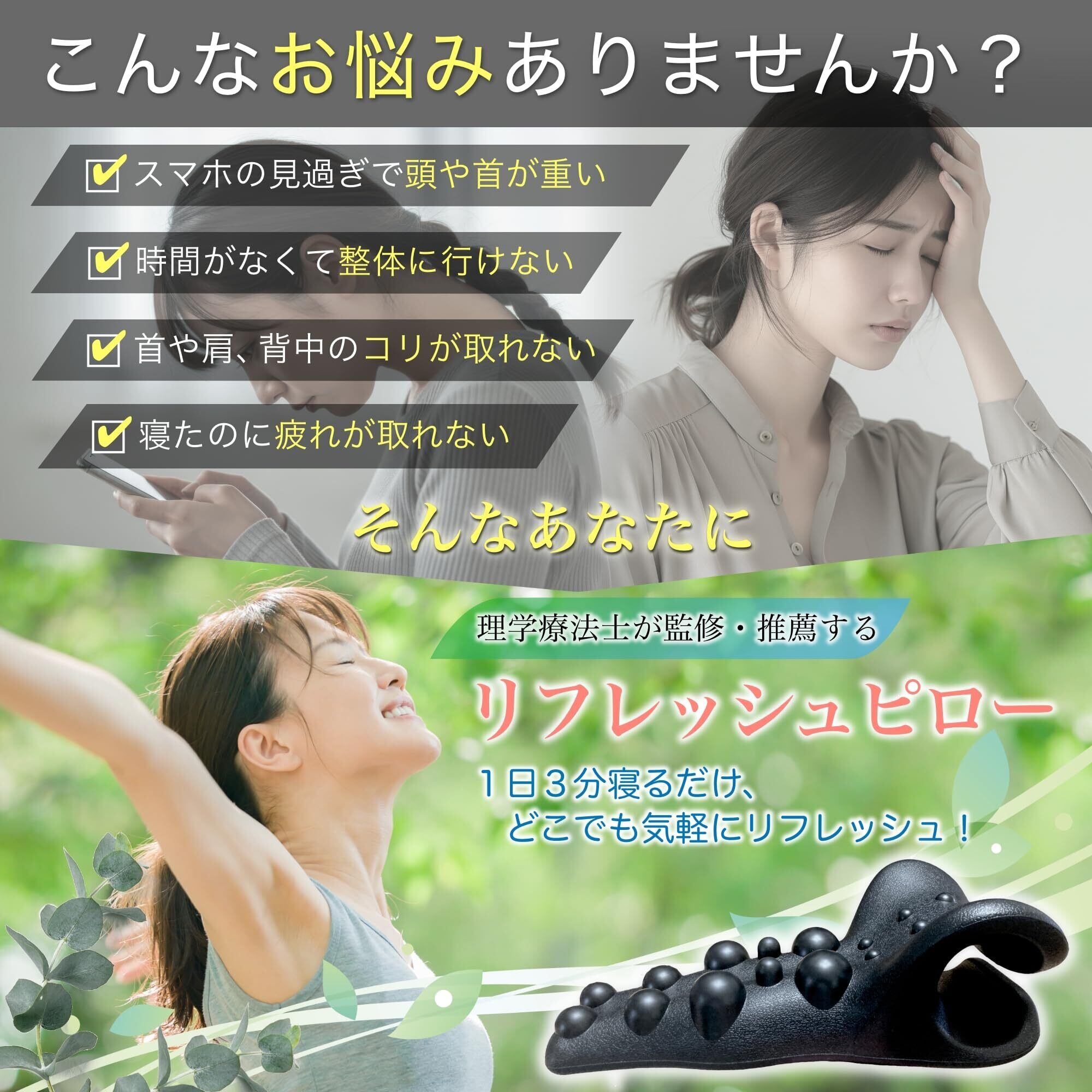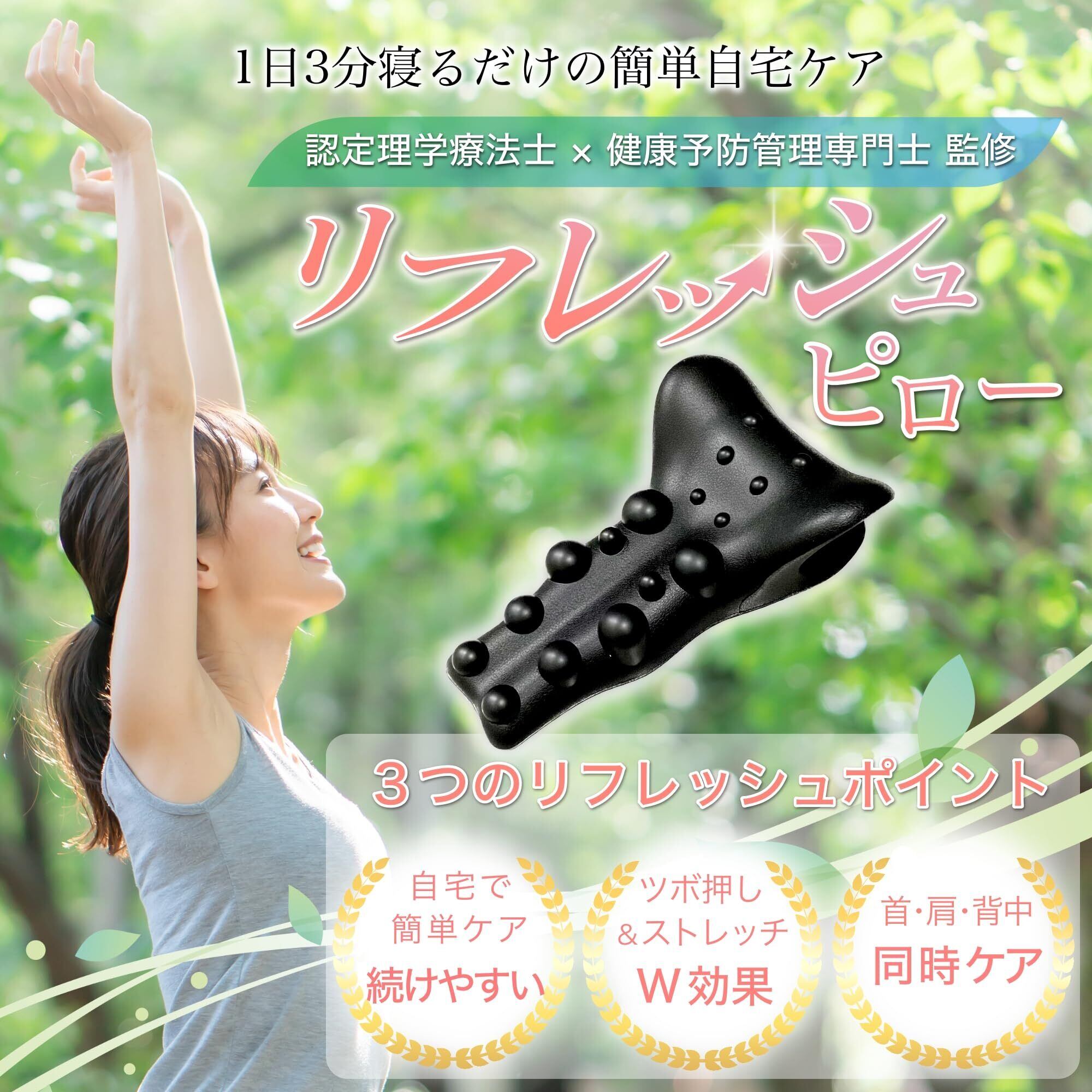 【ストレッチとツボ押しのダブル効果を実現!】リフレッシュピローは適度なストレッチ効果とツボ押しを同時にやることができる首ストレッチ、肩こり解消、肩甲骨はがしグッズです。 普段、整体に通わなければ自身では難しいような背中の硬くなった筋肉にダイレクトに刺激を与えることが可能です。同時に最適なストレッチ効果もあり、ほぐしながら伸ばすダブルの効果がより背骨の動きを引き出してくれます。