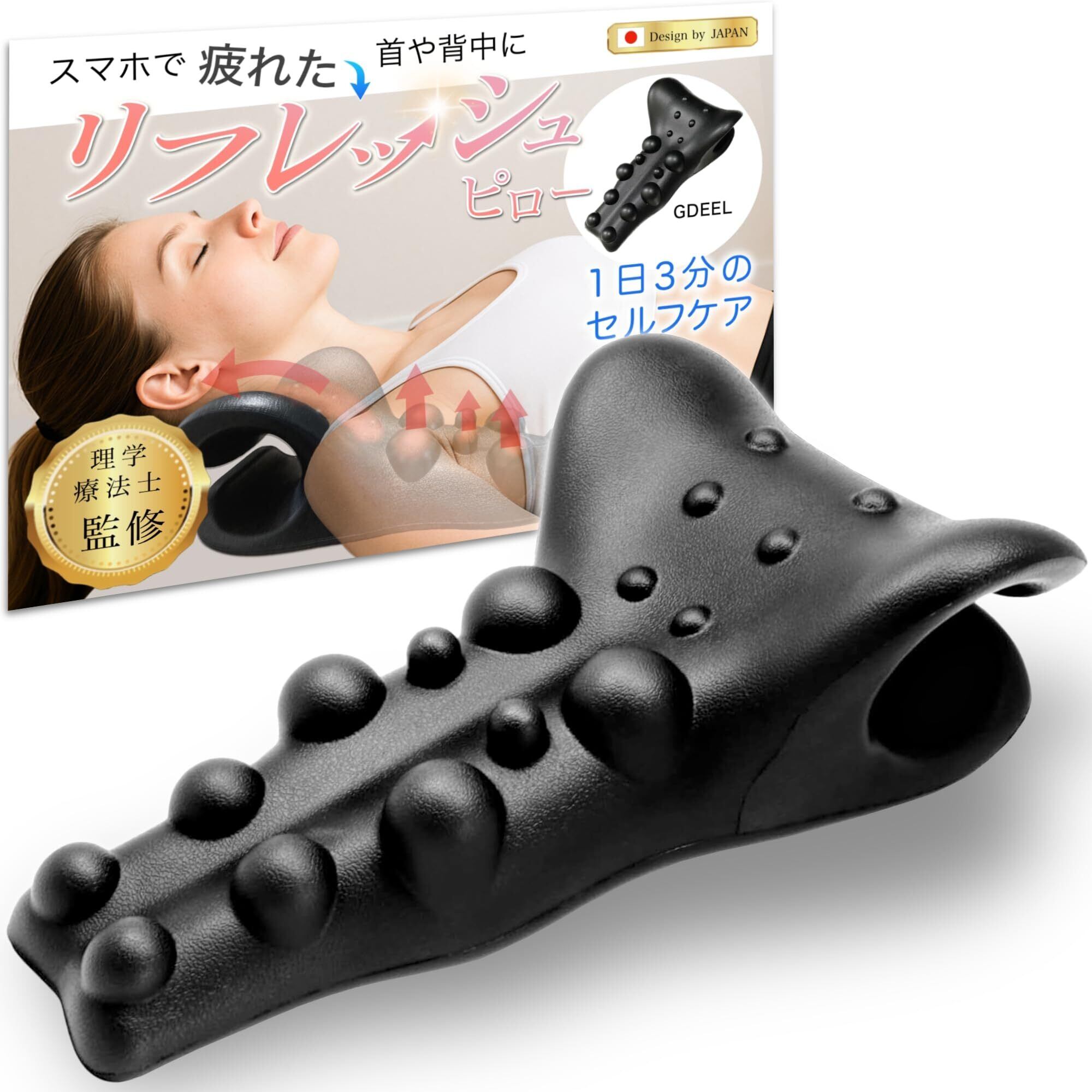 【 ストレートネックや筋膜リリースに熟知したプロが推薦】GDEELのリフレッシュピローは理学療法士×健康予防管理専門士が監修、おすすめするネックピローです。首から背骨周りの凝り固まった筋肉を適度にほぐし、同時に自然なカーブのネックピローが程よいストレッチ効果で首を優しく伸ばします。 首のこり、ストレートネック、肩こり、肩甲骨はがしなど様々な症状に使用できます。スマホ首、肩こり、肩甲骨はがしに対応した解消グッズとして、身体のケアをサポートしてくれます。