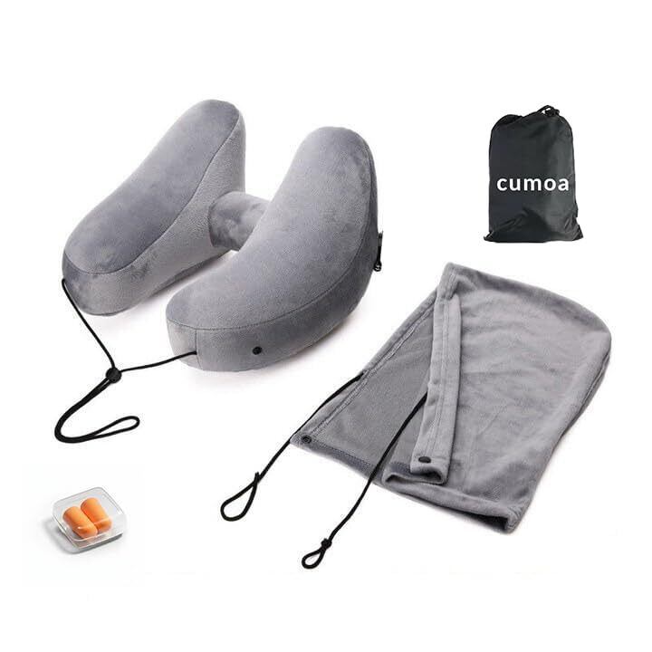 【数量限定】【理学療法士推薦】cumoa H型 ネックピロー 超軽量 240g フード付き 丸洗い飛行機 旅行 夜行バス 新幹線 車 機内 出張 昼寝 オフィス 女性 移動 子供 首枕 エアー エアーピロー クッション 空気枕 携帯枕 誕生日 ギフト プレゼント 結婚記念日 父の日 母の日 帽子付き アイマスク 耳栓 グレー