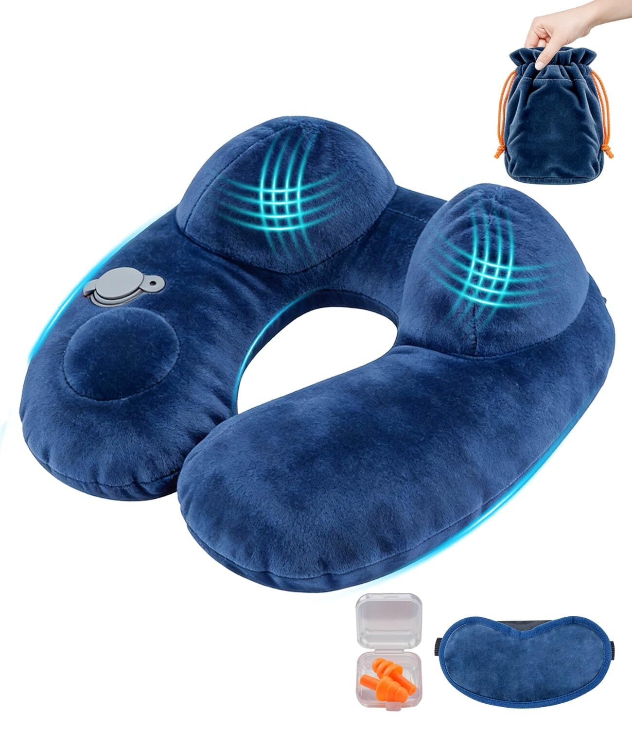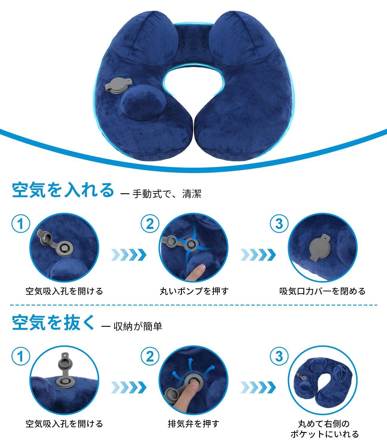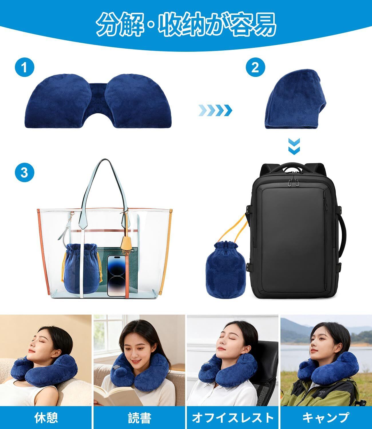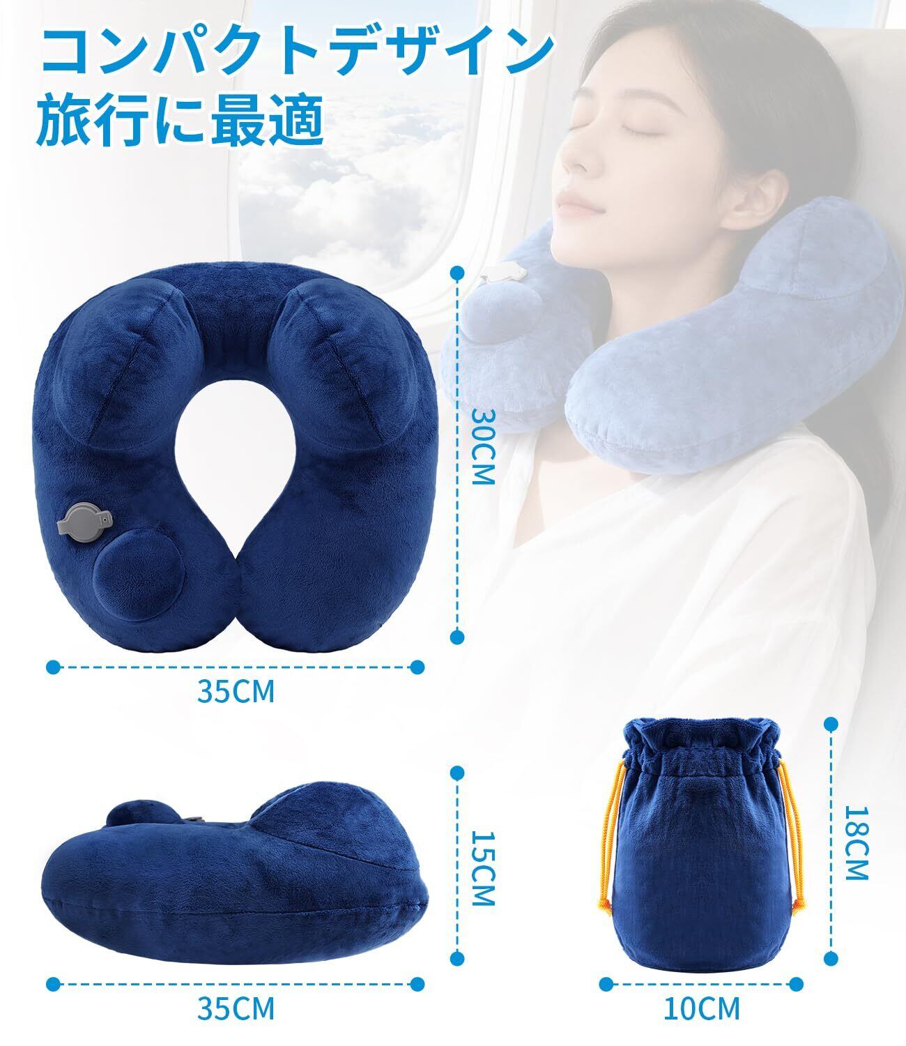 携帯枕 ネックピロー 首枕 旅行用 空気枕 飛行機 コンパクト エアーピロー 飛行機 携帯枕 旅行便利グッズ 持ち運び便利 オフィスグッズ トラベル 収納バッグ付き U型 (ネイビーセット)