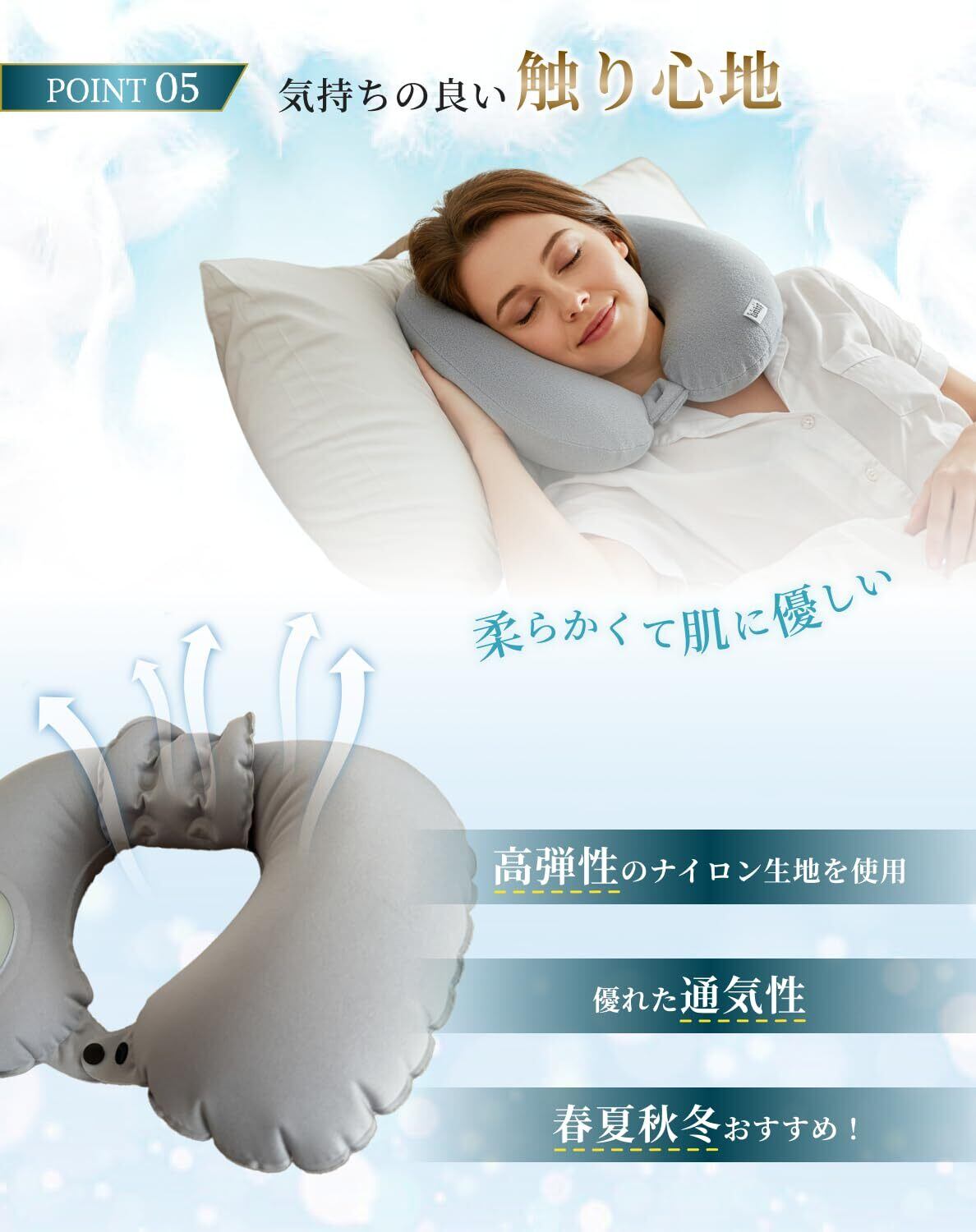【医師監修x人間工学設計で快適フィット】 医師監修の高品質なネックピロー! ヘッドレスト付きで首や頭をしっかり支え、長時間の移動やデスクワークでも自然な姿勢をキープするエアーネックピローです。また、飛行機・新幹線・バス・職場・自宅での仮眠に最適で、大切な休息時間をもっと快適にサポートします。 【エアーポンプ式で簡単空気調整】 わずか30秒で膨らみ、空気抜きも一瞬! 口をつけずに膨らませるから衛生的です。 また、自分好みの硬さに調整可能で最高のフィット感を実現します。 【超軽量xコンパクトなトラベルピロー】 重さわずか100gの驚きの超軽量設計! 付属の専用袋にすっぽり収まり、荷物の邪魔にならないので、いつでもどこでも快適な休息が可能です。 旅行や出張の荷物もかさばらず、携帯枕としても大活躍です。 【清潔で快適な使用感】 長時間使用しても蒸れにくく、さらっと快適な使い心地をサポート! 高弾性ナイロン生地で、しなやかな肌触りです。 優れた通気性でムレにくく、オールシーズン快適に使用出来ます。 【6ヶ月の安心付き】 万が一初期不良があった場合は、交換・返品・返金対応いたしますので、安心してご購入ください。