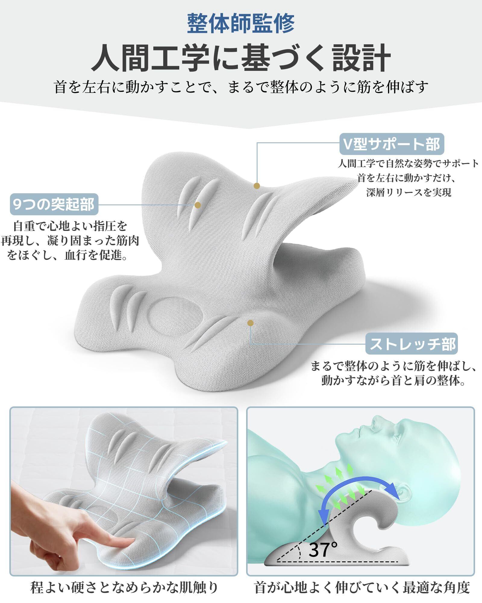 【人間工学で肩のサポート】整体師監修したネックピローは無理のない自然なアプローチで、ご自宅にいながらプロの整体体験を実現。人間工学を基づいて、首を楽になる三つのこだわり設計!◎9つの突起部:首を乗せるだけで、まるで専門家の施術のような、じんわりと効く一点一点の刺激。凝り固まった筋肉をほぐし、血行を促進。◎V型のサポート部:人間工学で首を支え、正しい寝姿勢に導く。◎ストレッチ部:まるで整体のように筋を伸ばし、寝ながら首と肩の整体。