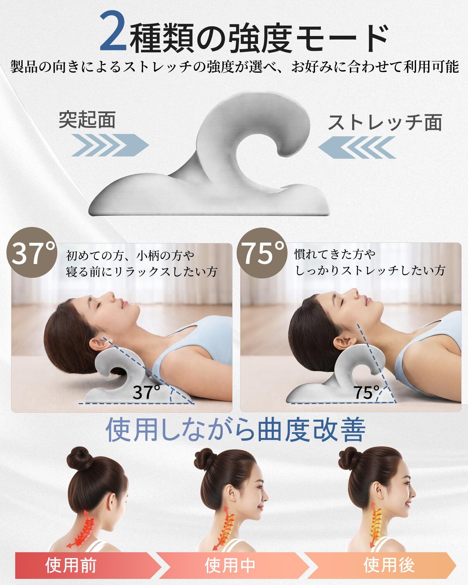 【二種類の強度パターン】お客様の声から生まれた WAY仕様/、リラックスと本格ストレッチ、好みに合わせて枕の高さと引っ張り強度を自由調節できます。正面は37°で首を優しく伸ばし、初めての方や寝る前にリラックスしたい方にお勧めです。背面は75°で首筋を完全に伸ばし、慣れてきた方しっかりストレッチしたい方にお勧めです。