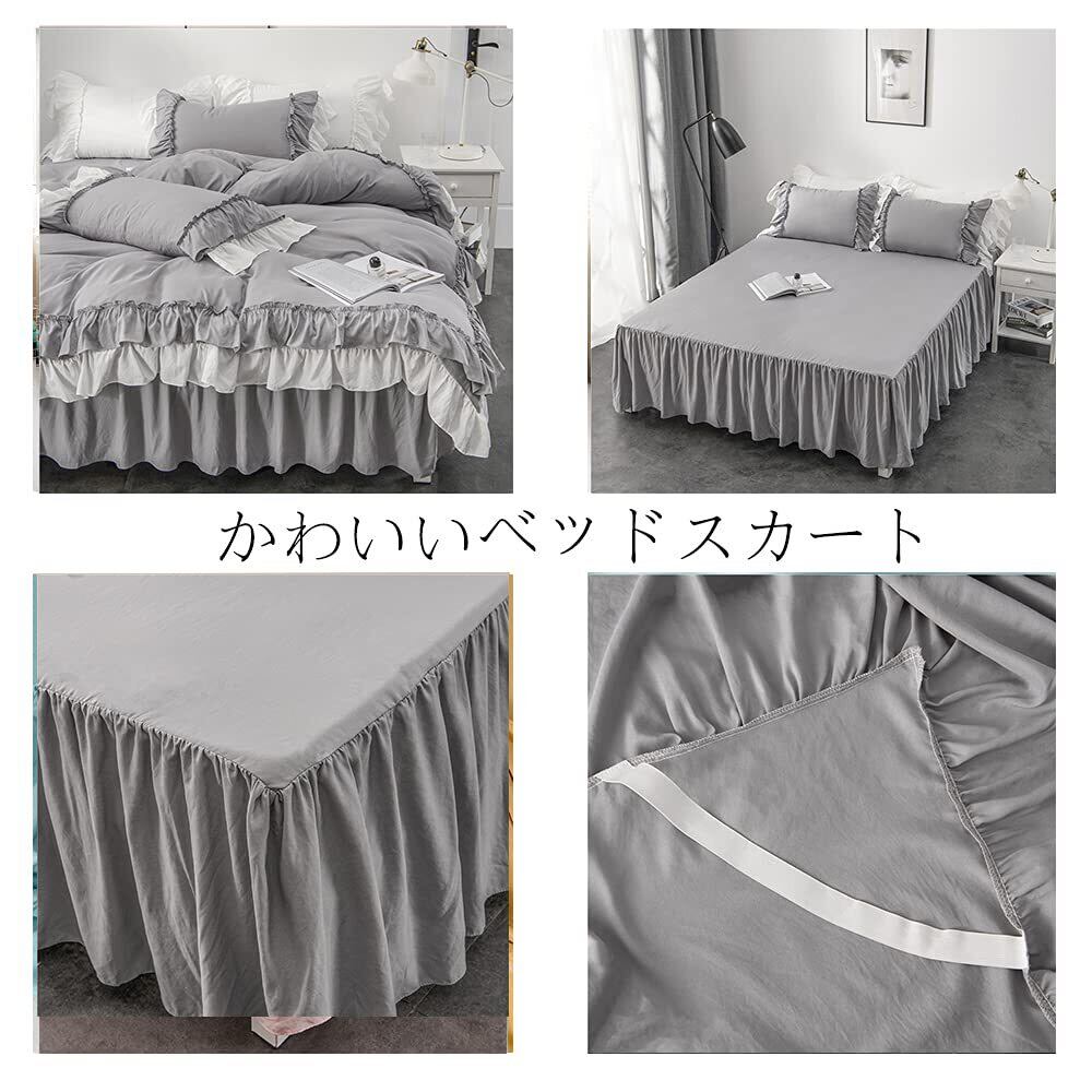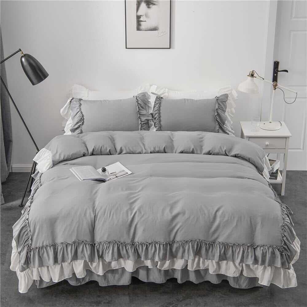 Ovege 布団カバー シングル 3点セット 掛け布団カバー ベッドスカート 洋式 枕カバー かわいい フリル付き おしゃれ ベッド用 布団用 ベット 寝具カバー 姫系 ピーチスキン加工 北欧 安心 抗菌防臭 洗い替え速乾 (グレー・フリル, シングル・3点セット)