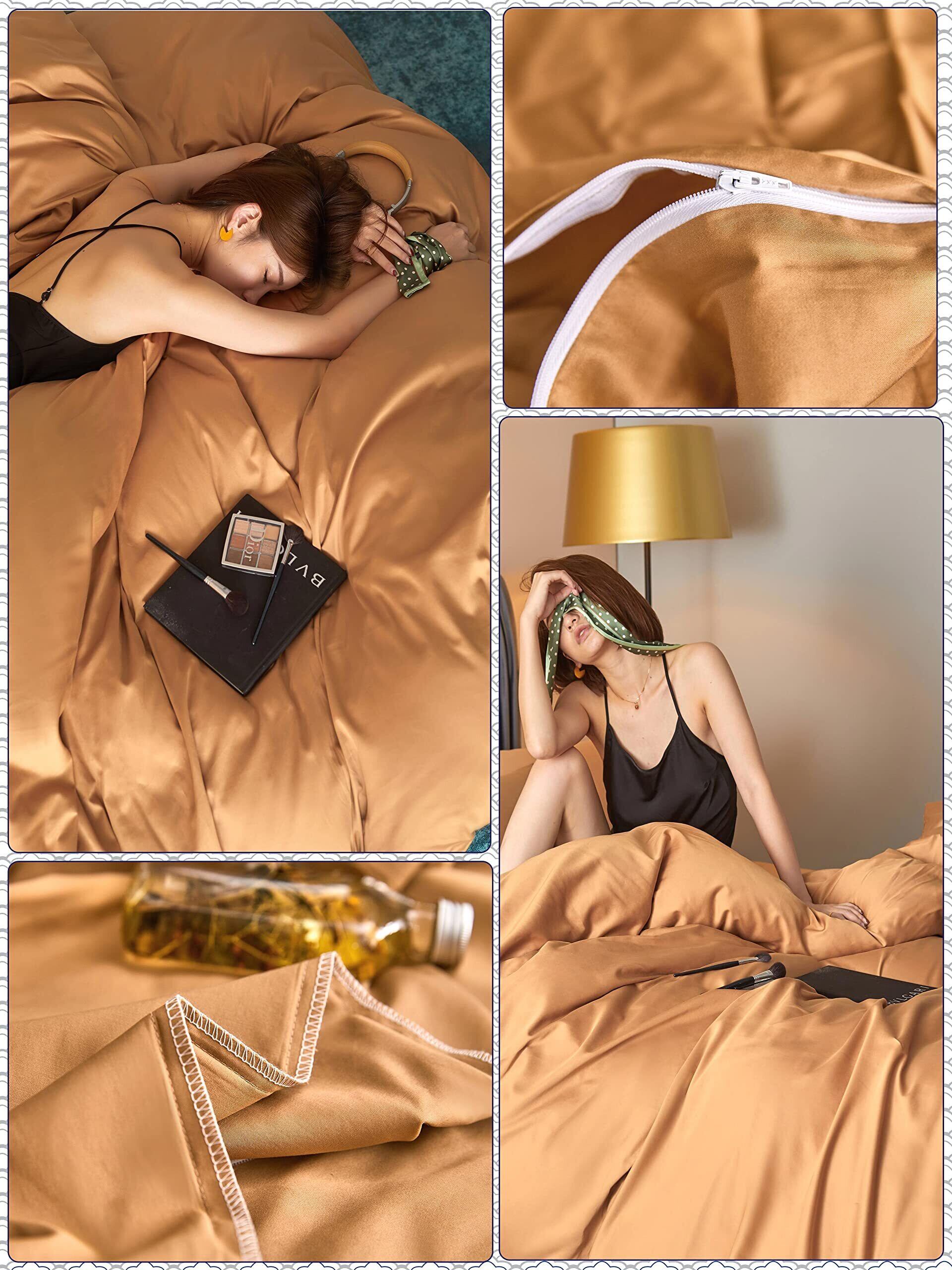 MILDLY 布団かばーダブル 4点セット エジプト超長綿100% 布団カバーセット ダブル:掛け布団カバー ボックスシーツ 枕カバー*2 / 300TCサテン調:肌ざわりが良い 通気性に富んで 毎日の快眠で元気に過ごしたい方に(D・シャンパンゴールド)