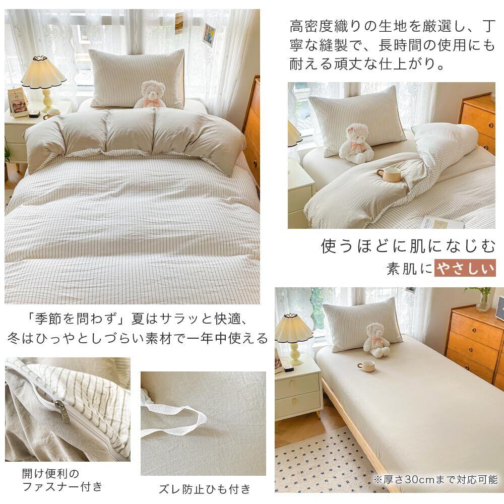 【肌触りの良さと快適性】こちらの布団カバーセットは、高級な水洗綿素材を採用しています。洗いを重ねるごとに素材がより柔らかくなり、肌に触れる感触が驚くほどなめらかで優しいです。心地よい眠りをサポートする通気性に優れ、一年中快適にお使いいただけます。朝目覚めたとき、この極上の肌触りに、思わず顔をうずめたくなる幸福をぜひ体験してください。