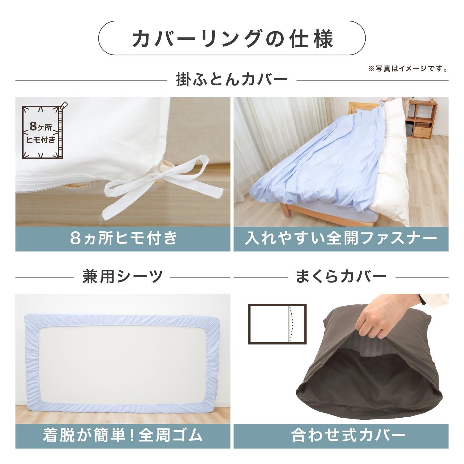 掛布団カバーの内側は8か所ヒモ付き。布団とつなげて使用中のズレ防止。