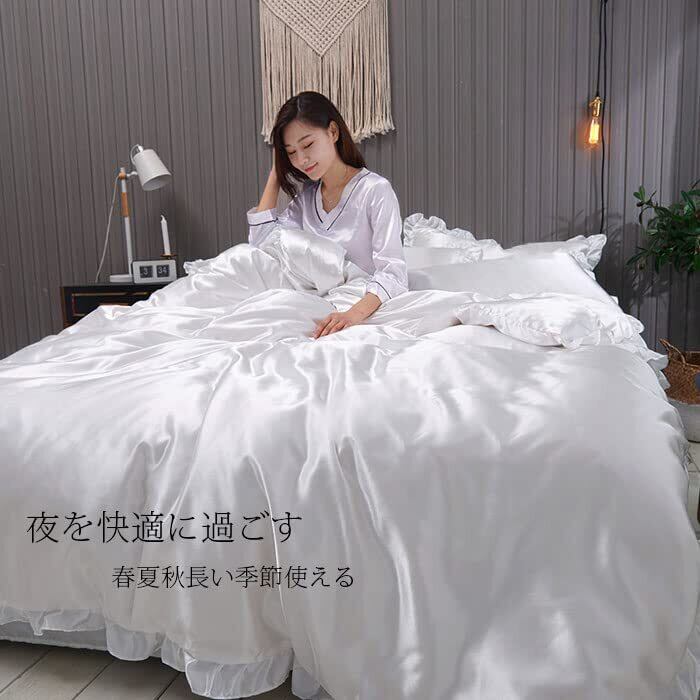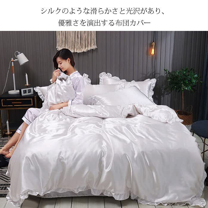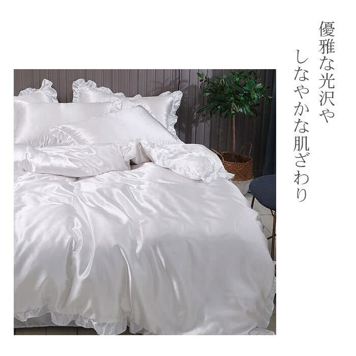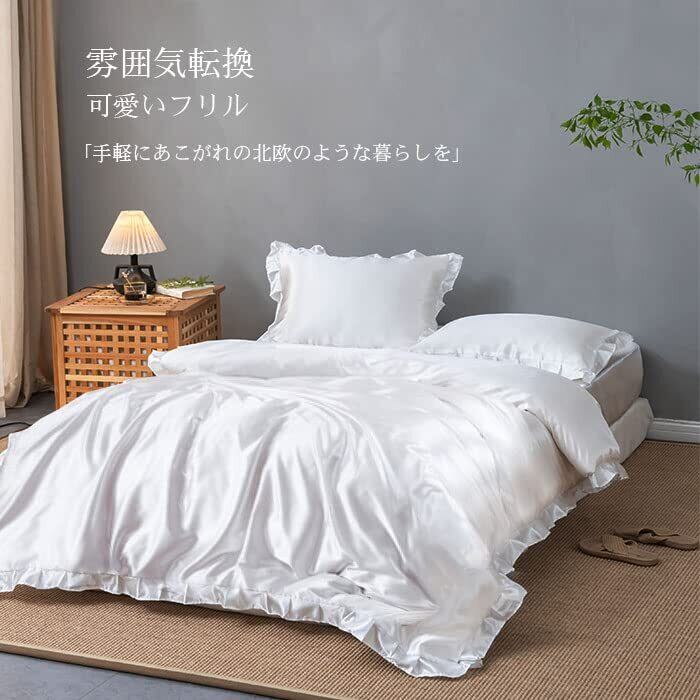 【在庫処分】布団カバー セット シルクみたい艶 ツルツル 冷感 フリル 春夏 シングル セミダブル シルクレーヨン素材 ずれ防止 肌に優しい ボックスシーツ 寝具カバーセット 掛け布団カバー 通気性 無地 肌触り 柔らか 枕カバー 引越し新居 丸洗いOK (シングル-3点セット, アイボリー)
