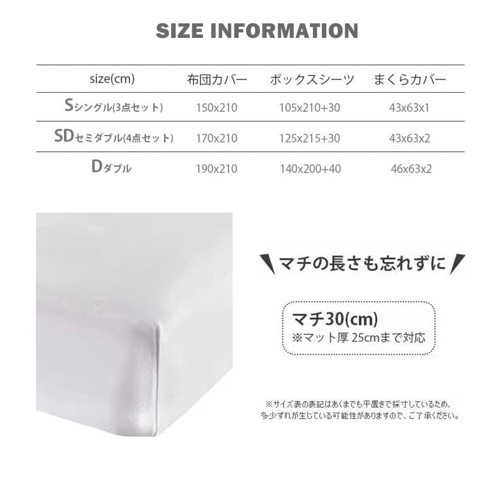 ◆サイズ:【シングルサイズ】 布団カバー:150cm*210cm ボックスシーツ:105cm*(210+30マチ)cm まくらカバー:43cm*63cm*1点. 【セミダブル】 布団カバー:170cm*210cm ボックスシーツ:125cm*(215+30マチ)cm まくらカバー:43cm*63cm*2点