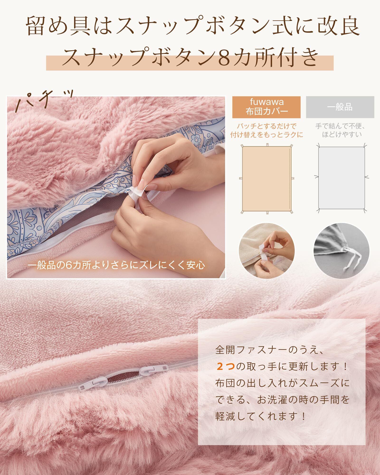 【全開ファスナー・8スナップボタン式で簡単!】片側に全開ファスナー使用、簡単着脱できます。8箇所のスナップボタンでしっかり固定します。眠っている間に動いてもズレたり丸まったりする煩わしさがありません。よりズレにくく、着脱もしやすく、お手入れが簡単なので、忙しい主婦の強い味方です。【抗菌防臭加工:99.9%防ダニ】側生地には抗菌防臭・防ダニ加工が施されており、発汗や皮脂の付着によるイヤな臭いの発生を防ぎ、清潔な使用感が続きます。抗菌防臭効果には、SEKマークを取得し、清潔さにご安心できます。