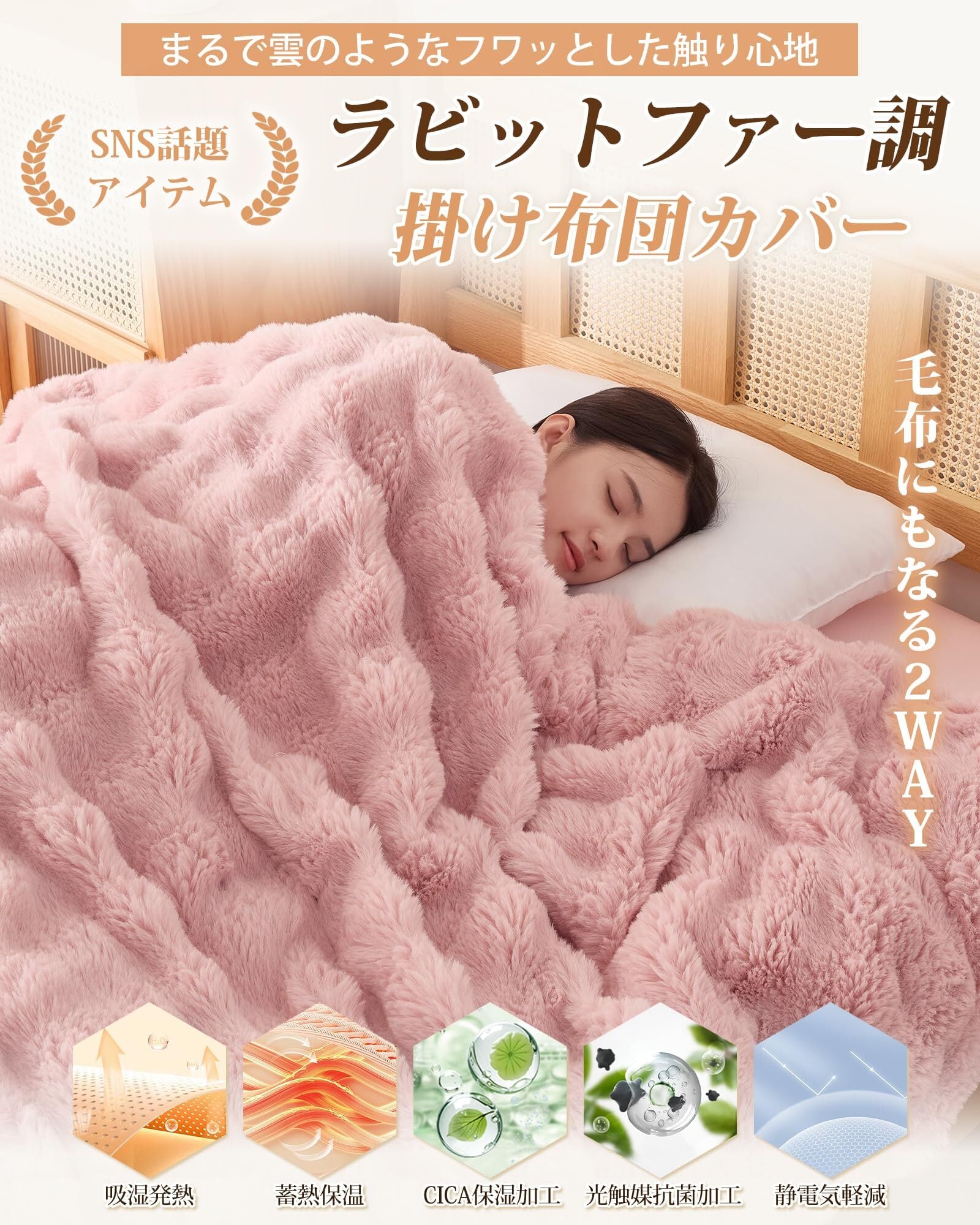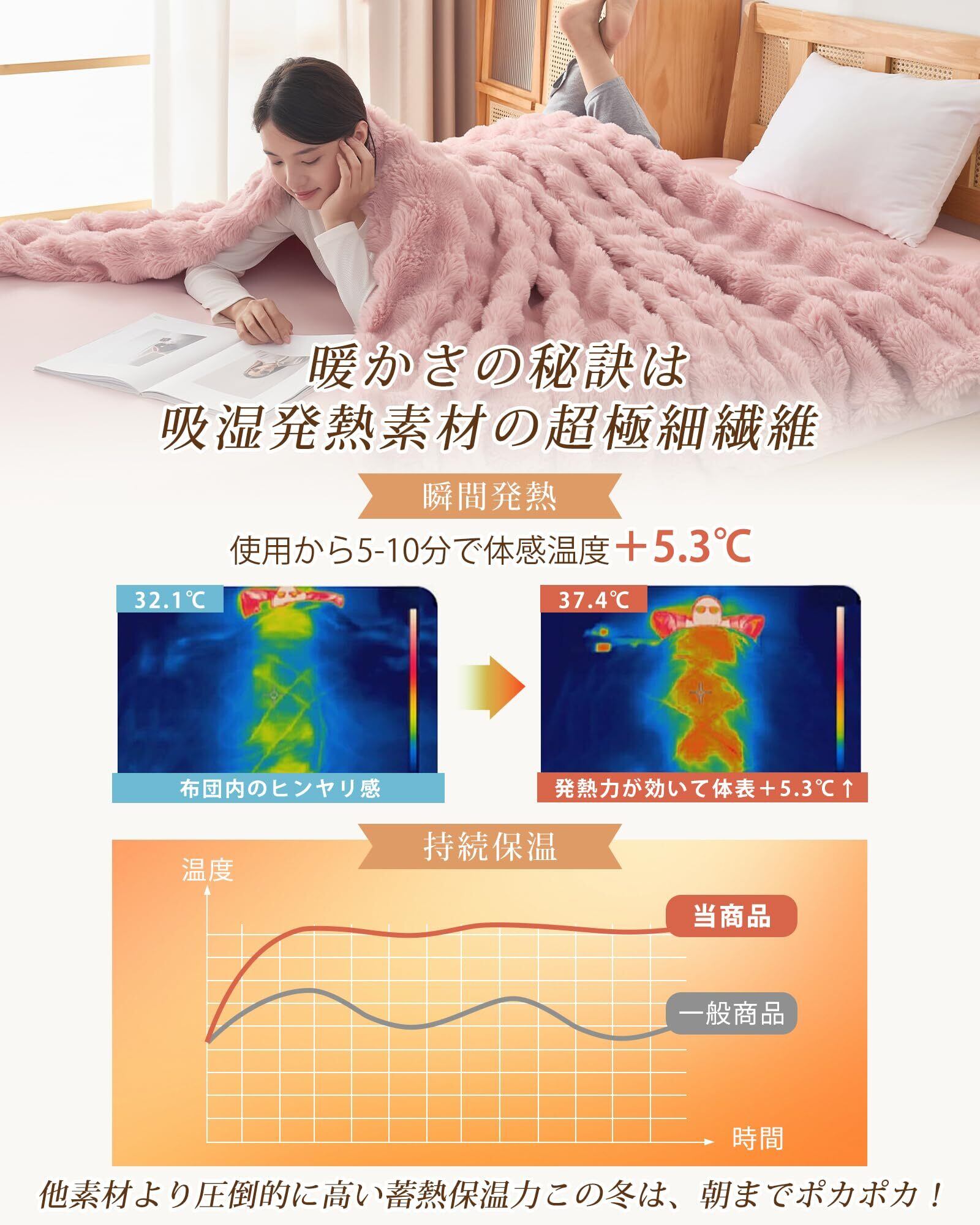 【プラス5℃蓄熱保温】480g/㎡高密度ラビットファー調生地とフランネルの組み合わせで、普通のフランネルカバーより、蓄熱保温効果が倍増!マイクロファイバーが高密度に詰まっており、毛足に空気を多く包み込んでいるため、暖かい空気をしっかりと閉じ込め、身体の熱を保持します。人体が放出するエネルギーを吸収し、布団内部の温度を上げ、熱を蓄えます。布団に入った瞬間、ふわふわぽかぽかな暖かさに包まれます。