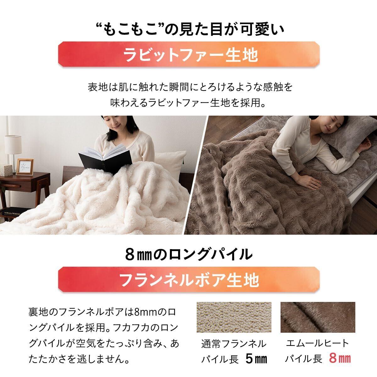 【サイズ】シングル:約幅150×奥行210cm 【組成】■表地 ポリエステル100%(ラビットファー生地 300g/m²) ■裏地 毛羽部分:ポリエステル100%(フランネルボア)/グランド部分:ポリエステル70%、レーヨン30%(エムールヒート50%使用)※パイルの長さ:8mm ■裏面 糊加工仕様