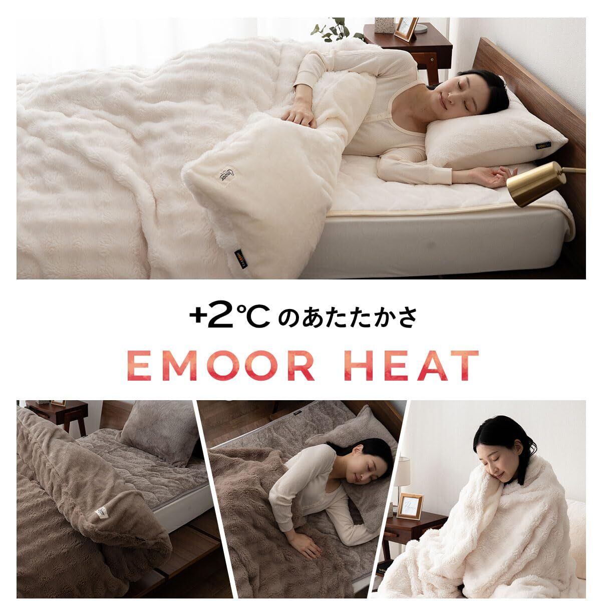 あなたの毎日に+2℃のあたたかさを。エムールの冬の自信作「エムールヒート」シリーズから、ラビットファータッチ素材の「ふわふわタイプ」が登場!もちっとやわらかく、思わず頬擦りしたくなる心地よさです。極細繊維の8mmロングパイルが空気をたっぷり含み、暖かさを逃しません。