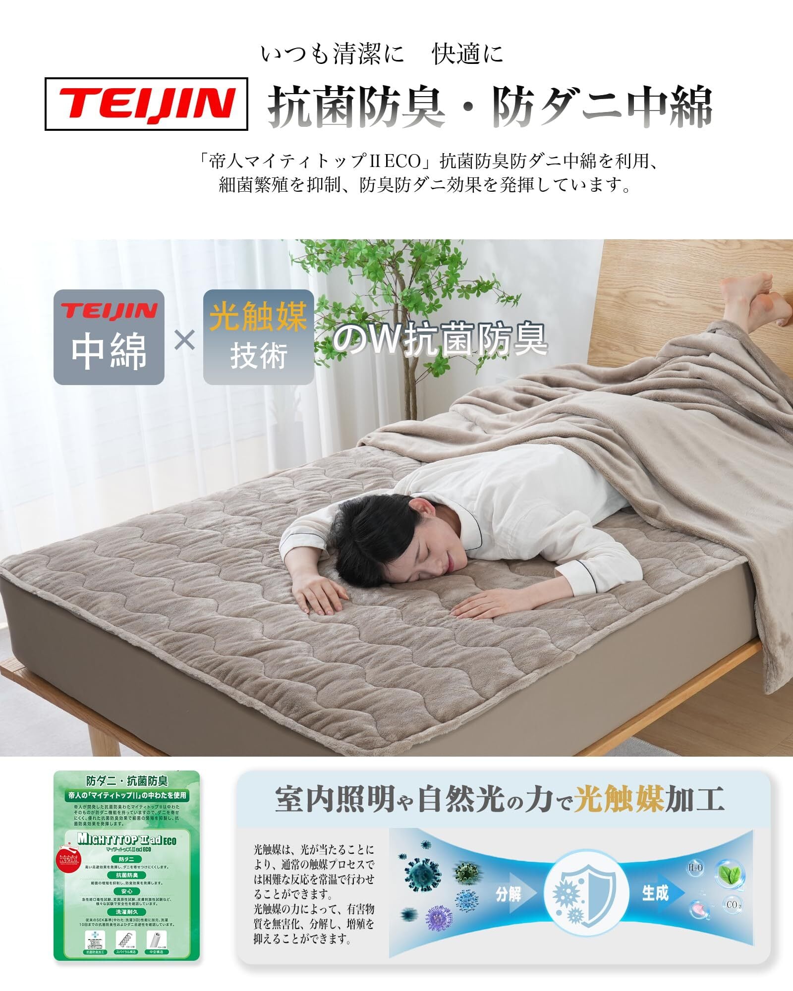 【帝人抗菌中綿×光触媒:敷きパッド一体型ボックスシーツ 冬 洗える清潔仕様】 清潔さを支える構造: ❶ 帝人マイティトップⅡECO中綿: 冬用ボックスシーツはTEIJIN(帝人)マイティトップⅡ中綿を使用し、優れた抗菌防臭効果で、細菌の繁殖を防ぐ抗菌・いやなに臭いを抑えます。通常の繊維と比べて、洗濯耐久性を実現しています。 ❷ 光触媒加工: 蛍光灯や白色LEDなどのわずかな光でも、除菌や防臭・防ダニ効果を期待でき、高品質な生活を追求する方々のニーズに応えます。