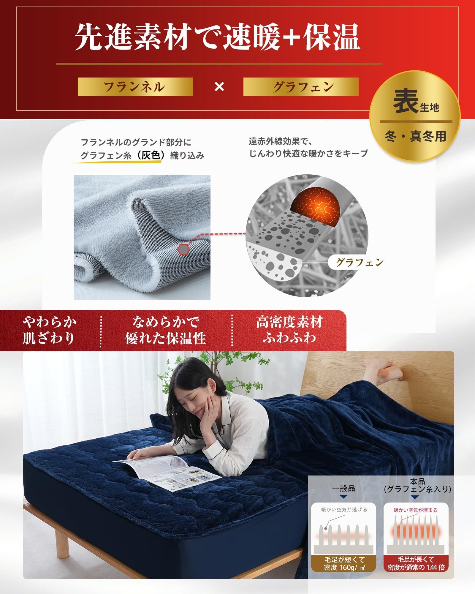 【ボックスシーツ 冬新6層構造:進化の保温力で即寝落ち】 熱力学に基づいた新6層構造で暖かさを徹底最適化: 表層:グラフェン練り込み高密度フランネル(発熱層)。 W発熱層:グラフェン入り中綿発熱層+帝人中綿抗菌防臭層。 W蓄熱層:アクリレート中綿蓄熱層+エアロゲル断熱層。 裏層:ポリエステルパイルシャーリング(通年使用層)。 進化した構造のあったかボックスシーツが、寝ている間に、発熱・蓄熱・保温・断熱が繰り返されるため、それぞれの機能を重ね合わせることで持続的な保温効果を実現しています。
