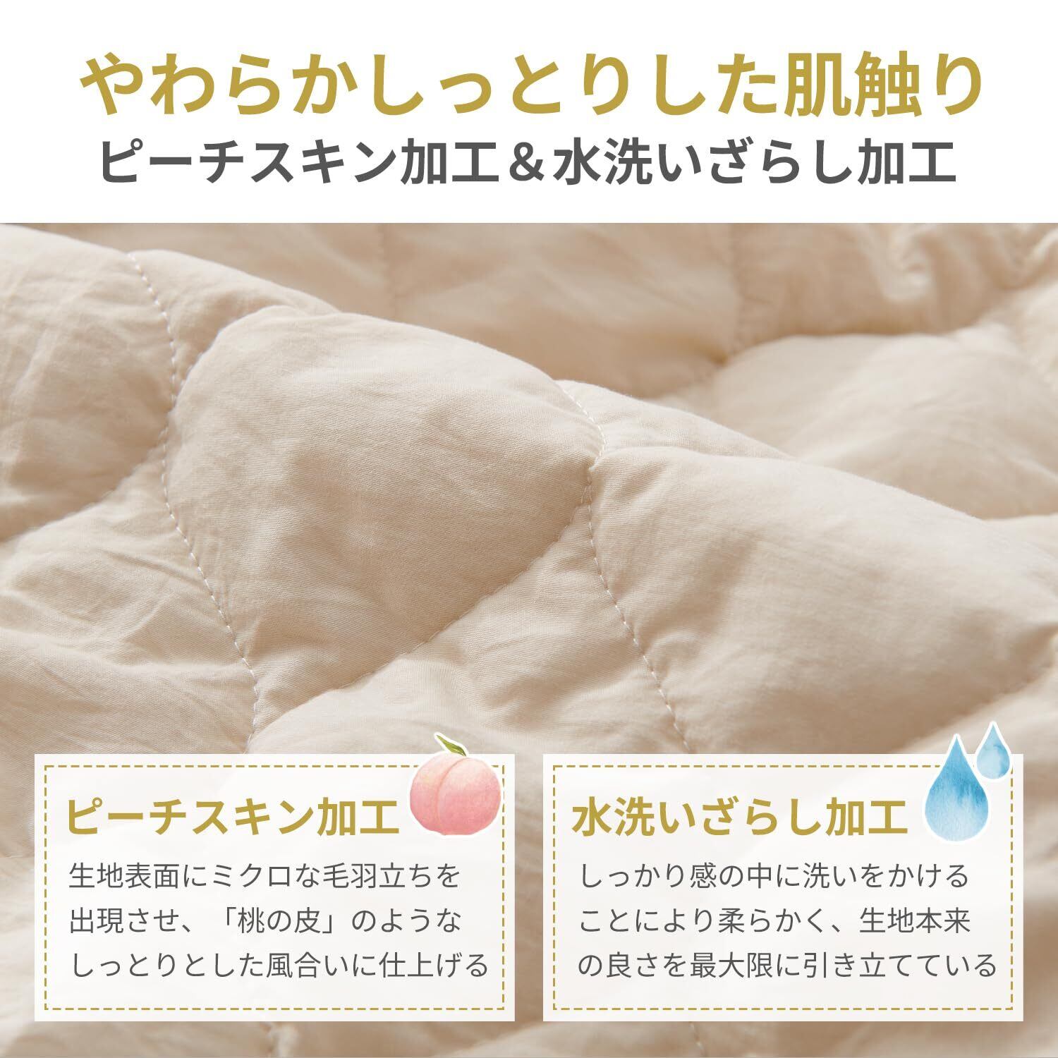 【柔らかさが増す洗いざらし加工】何度も洗うことで自然な風合いと柔らかさが増す「洗いざらし加工」を施しています。最初からふんわりとした肌触りを楽しめ、使うほどに柔らかくなり、肌に優しくなじみます。この加工により、毎日使用する寝具がより心地よく、長期間使い続けられます。
