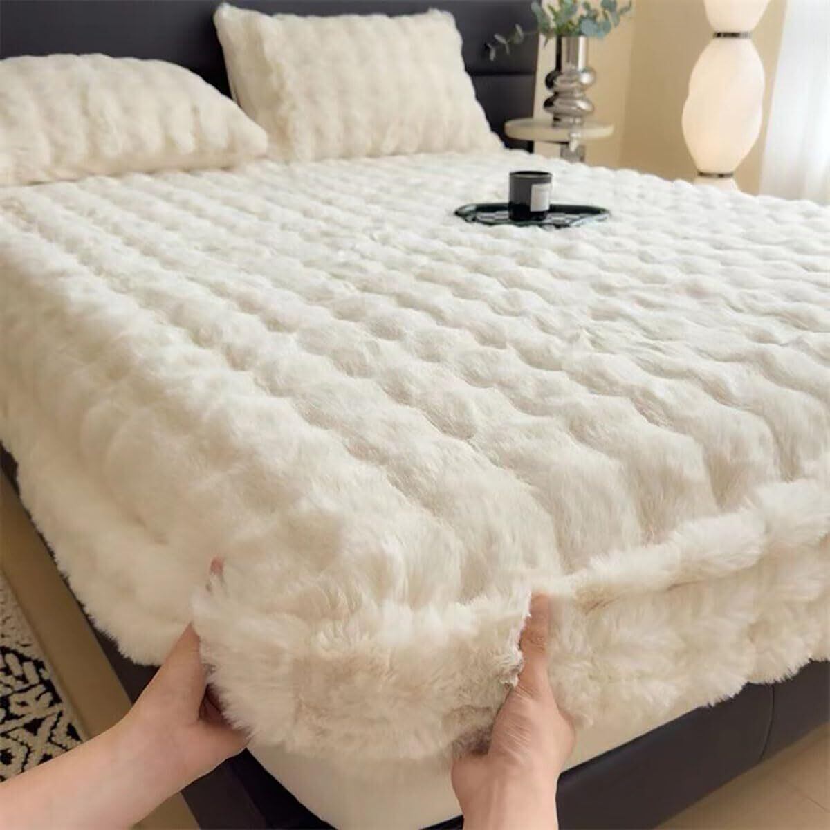 【特価商品】ボックスシーツ 冬 シングル セミダブル ダブル ベッドカバー ベッドシーツ マットレスカバー シーツ あったか 暖かい 柔らかい ふわふわ ラビットファー調 布団 全周ゴム付き 着脱簡単 静電気防止 防寒 洗える 敷き布団カバー (ホワイト,150x200cm)