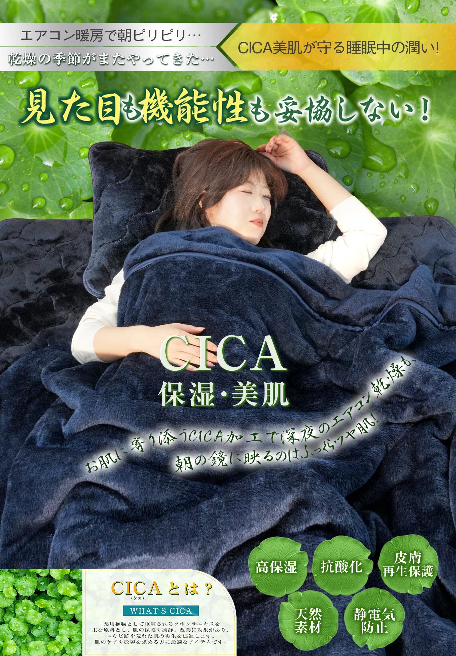 【三重静電気防止・CICA保湿配合】2枚合わせ毛布に天然CICA成分を配合。保湿成分で肌の乾燥を防ぎます。また、生地に編み込まれた特殊導電糸が、静電気を素早く拡散・除去します。洗濯後も効果が持続する安心設計。さらに生地表面に抗静電気加工で静電気をトータルでプロック。不快なパチパチなどのストレスが無く毎日快適に眠れます。