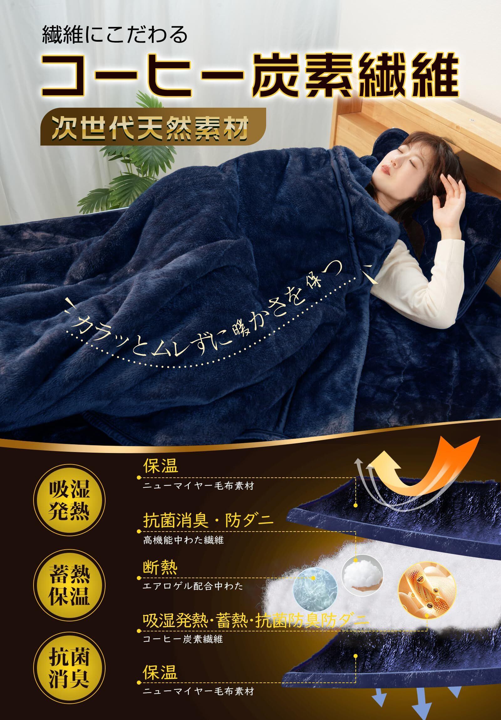 毛布 シングル 2枚合わせ毛布 【エアロゲル×天然コーヒー炭素繊維】 暖MAX構造 あったか ブランケット 冬 厚手 高機能中わた 吸湿発熱 蓄热保温 ふわふわ 三重抗菌消臭 CICA保湿配合 三重静電気防止 軽量 衿付き 洗える (ネイビー・140×200cm)