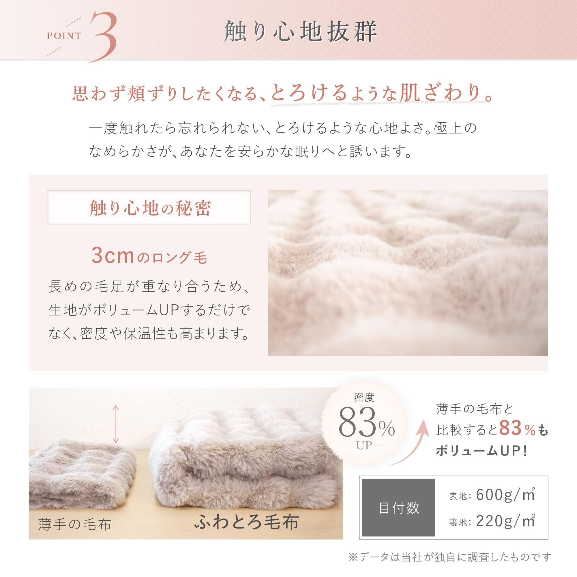 【ふわとろ毛布で姫気分】眺めているだけでうっとりとした気分になる「ふわとろ毛布」。 2種類のファーを重ね合わせたW構造で、ラグジュアリーで贅沢な肌触りを同時に味わえる高品質な毛布。 保温性が高く、寒い季節にやさしい素材で、包み込むように体をやさしく温めてくれます。
