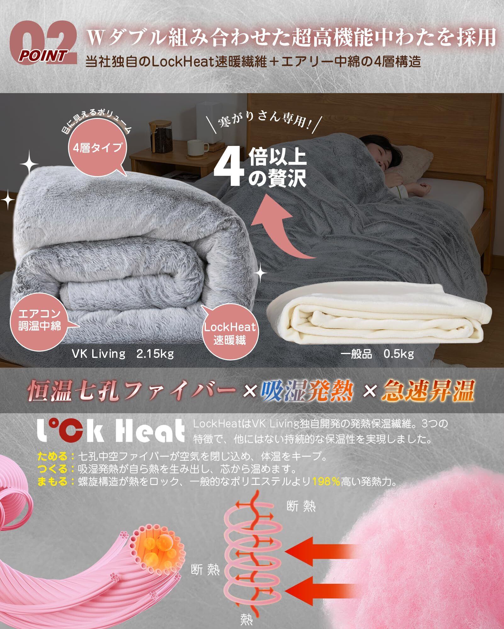 【W蓄熱保温4層タイプ】LockHeat速暖発熱繊維+エアリー中綿で毛布に入った瞬間ぬくもりに包まれます。目に見えるボリューム4層タイプ毛布は2.15㎏、普通の毛布(0.5㎏)より4倍以上の贅沢!寒がりさんにおすすめです。可愛いデザインで心も体も温まるアイテムです。