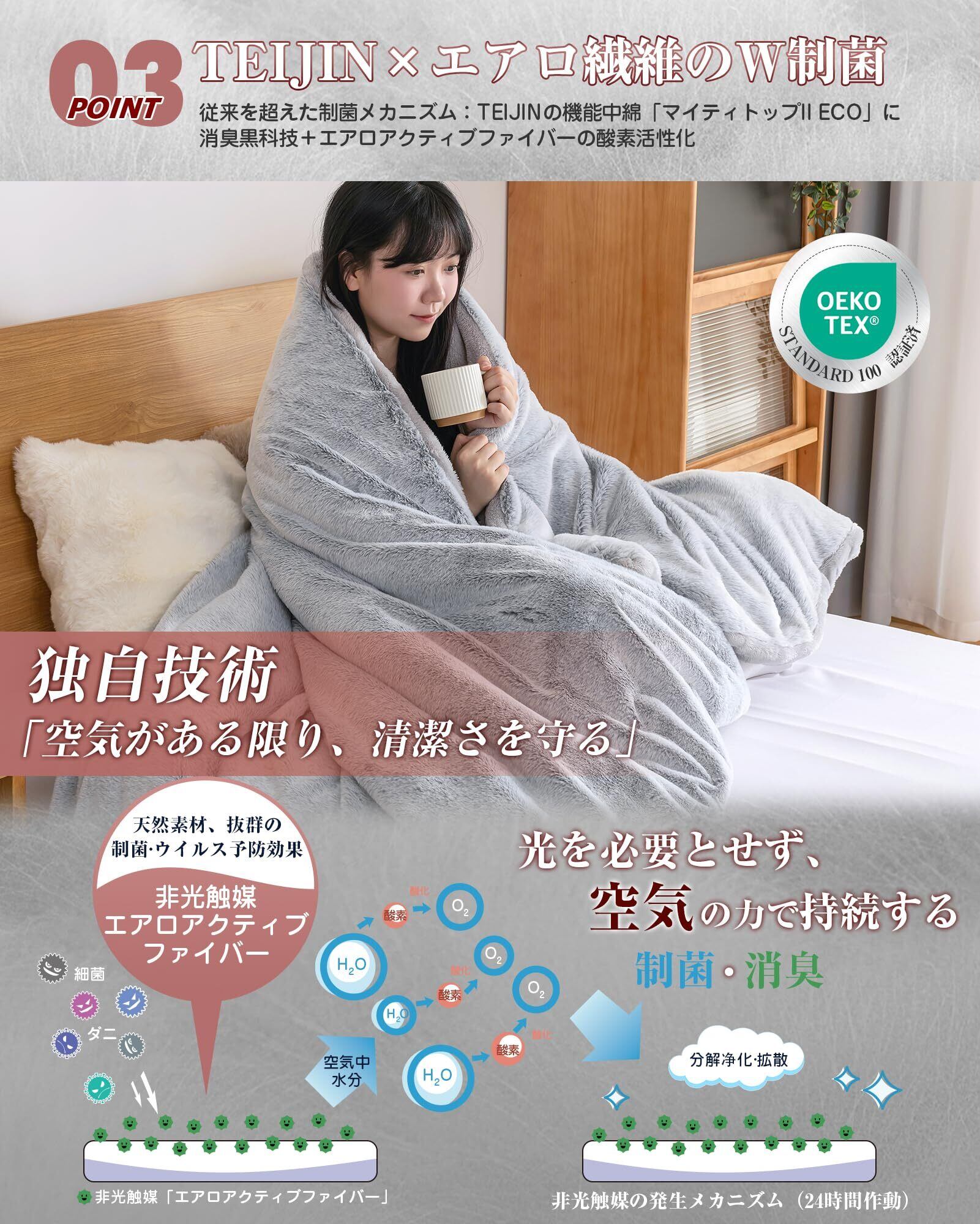 特徴 24時間持続的に制菌消臭, W蓄熱保温, 天然の保湿効果