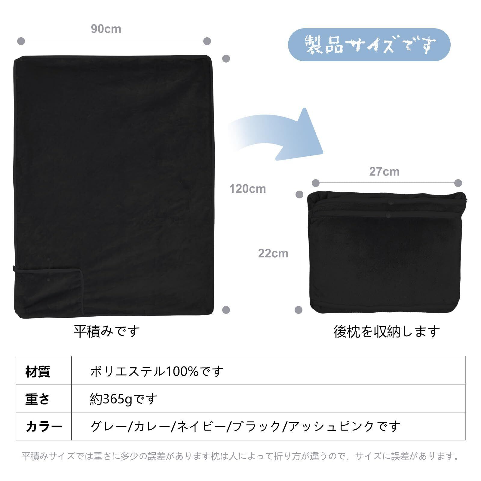 【商品仕様】ブランケットのサイズが約90*120cm、クッション時のサイズが約22*27cm/厚み7cmです。ブラック、グレー、ブラウン、ネイビー、グレーピンク五つの色があります。重さが約365gぐらいの軽量ブランケットです。