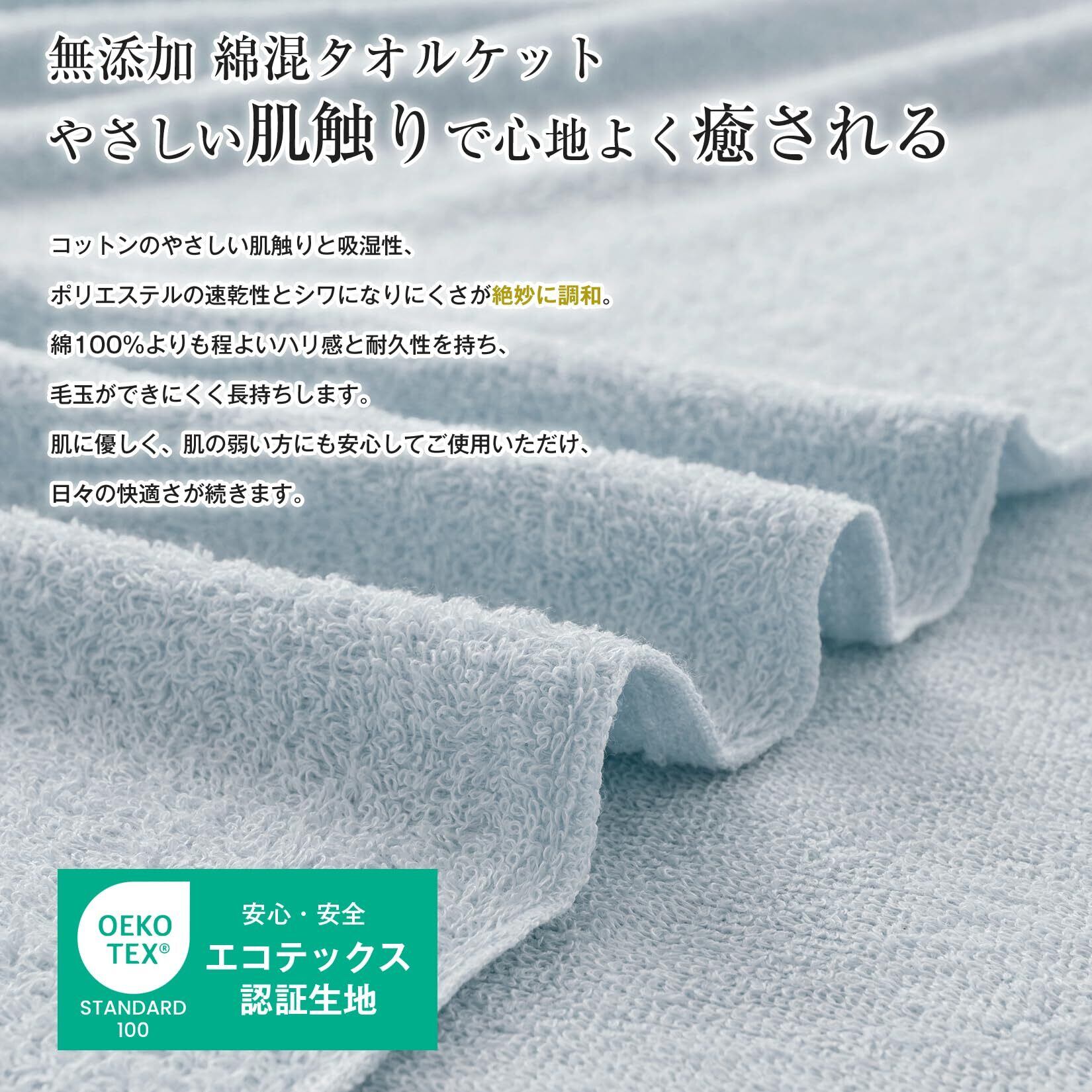 【無添加・安心のOEKO-TEX認証】信頼感を与えるOEKO-TEX認証を取得したタオルケットです。静電気を抑え、肌に優しく刺激が少ないため、肌への負担を軽減し、安心してご使用いただけます。