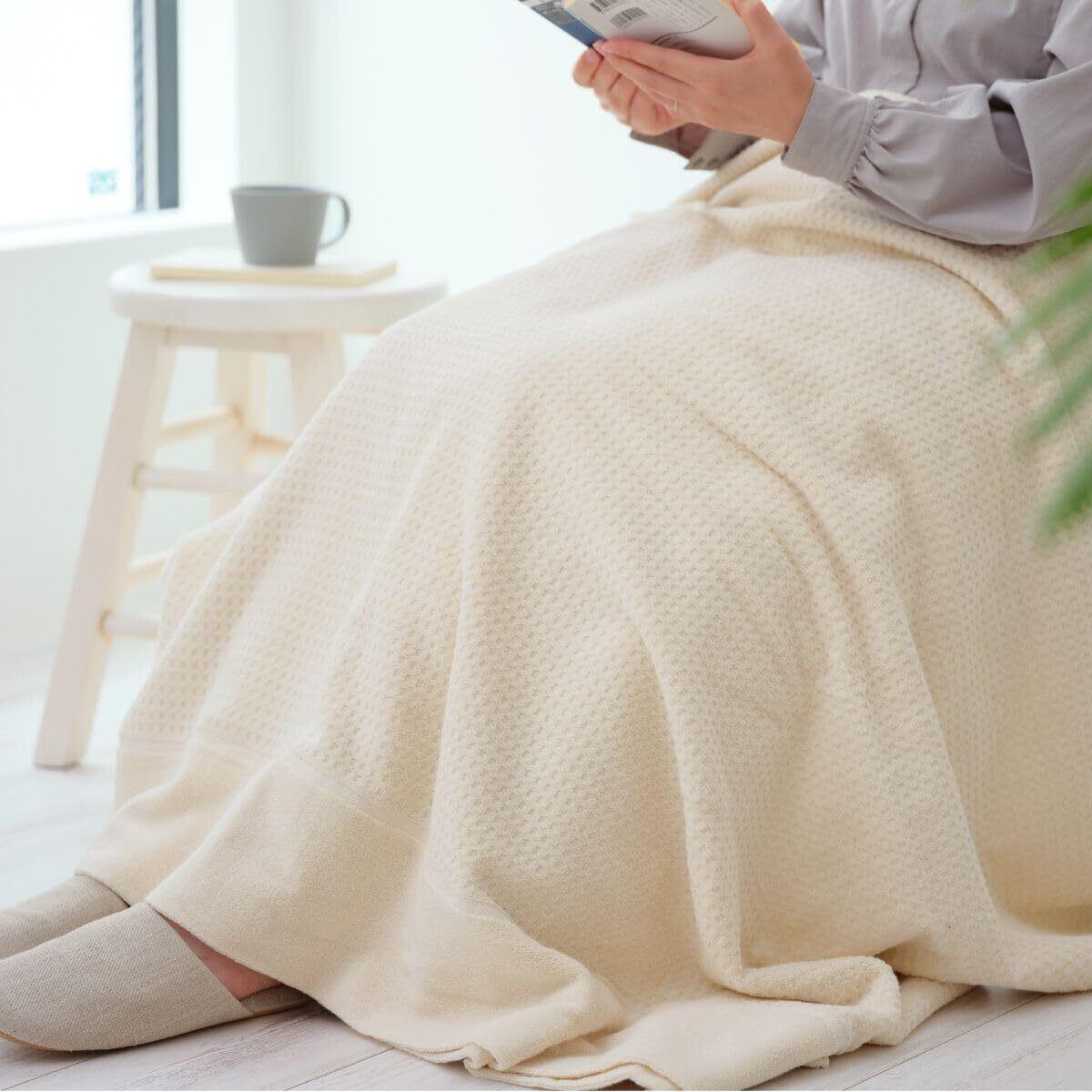 【ふわふわ肌触り】ワッフル柄の生地をふわふわに仕立てた「ふわっふるケット」。栽培からこだわったオーガニックコットンをパイル部分に使用しており、天然素材のタオルケットならではの優しい肌触りが感じられます。