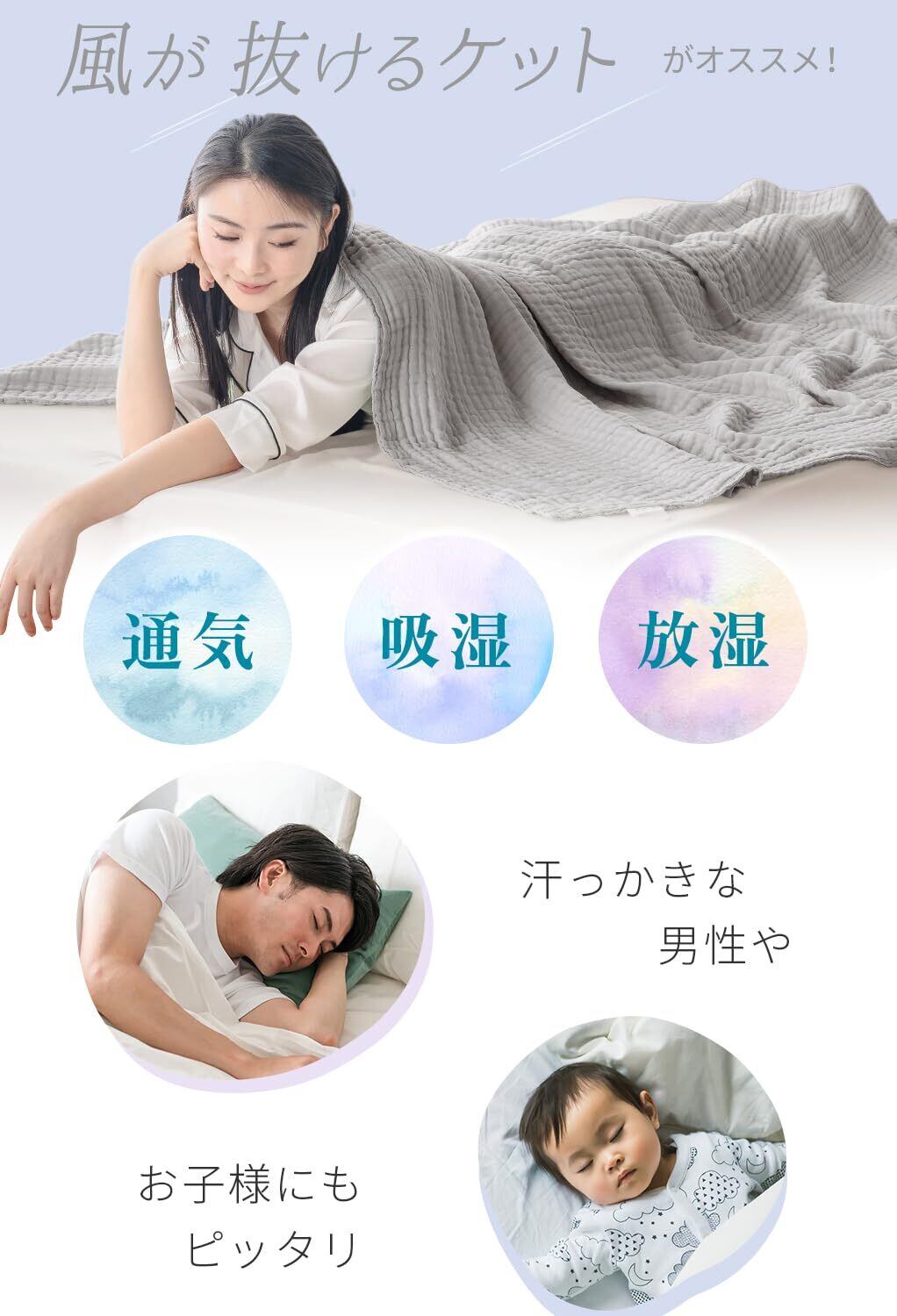 【冷房対策】心地よい眠りを誘う6重ガーゼ。ガーゼ生地を6重にしたことでやわらかい肌触りと、適度な通気性を実現。春から夏にかけて長くお使いいただけます。夏場の冷房対策、熱帯夜でも快適にお使いいただけます。
