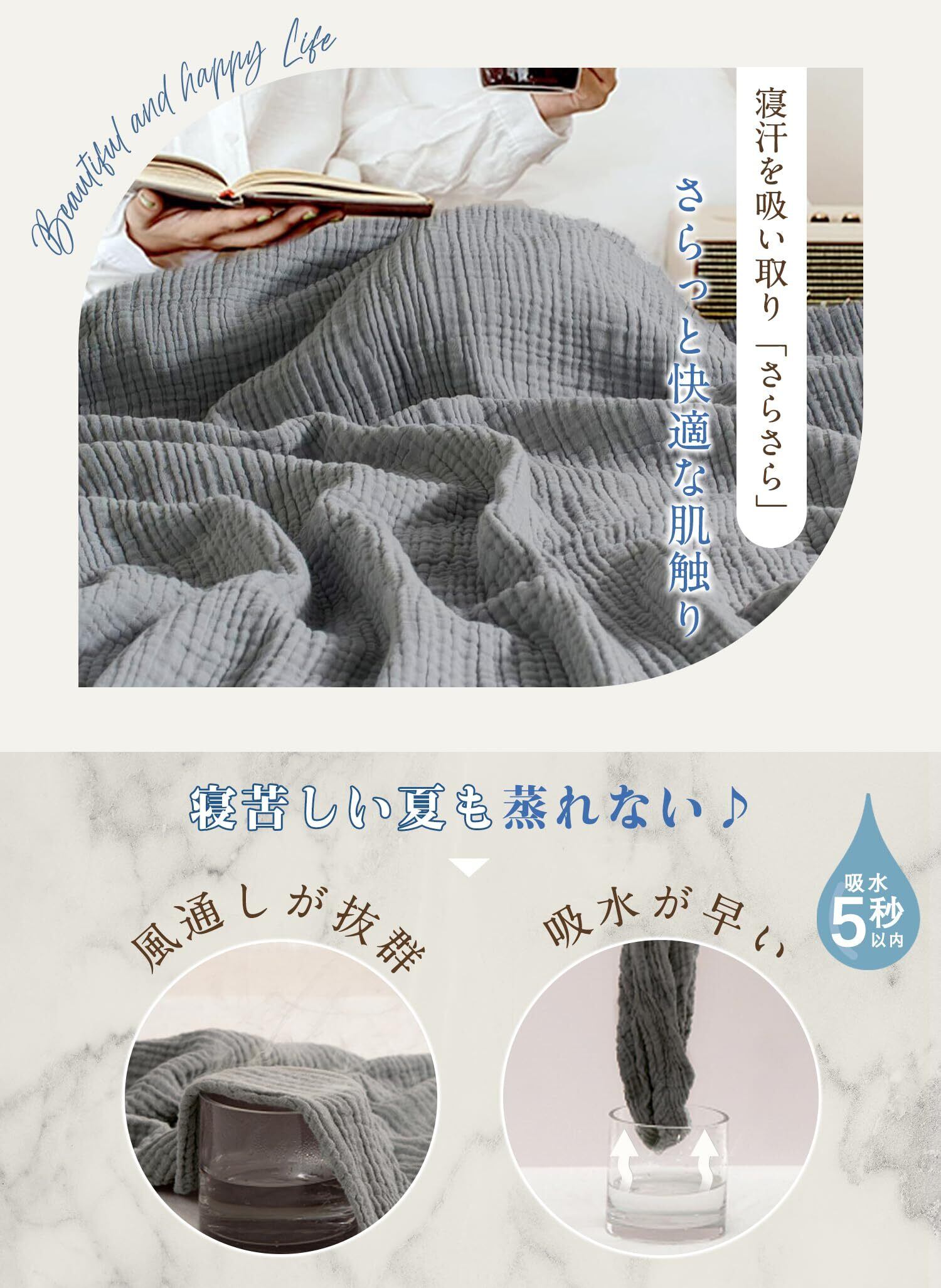 【吸水速乾】吸湿性と速乾性の良い綿100%で作られてきたガーゼなので、汗を素早く吸い取って放出して、蒸し暑い夜に寝汗をかいても蒸れずにさらっと快適に過ごせます。「冷房対策」ガーゼ生地を6重にしたことでやわらかい肌触りはもちろん、真夏にエアコンをつけても寒くはしません。
