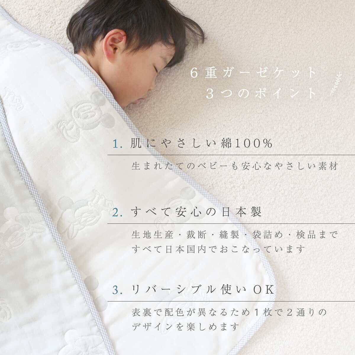 【こだわりのディズニーデザイン】リバーシブルOK!1枚で2通りの柄が楽しめる当店オリジナルデザインの6重ガーゼケットです生地生産・裁断・縫製・袋詰め・検品まで全ての工程ALL日本製!undoudouのこだわりの多重ガーゼシリーズです。パパとママもキュンとするベビーミッキー・ベビーミニーデザイン。≪ディズニーベビー≫ (C)Disney