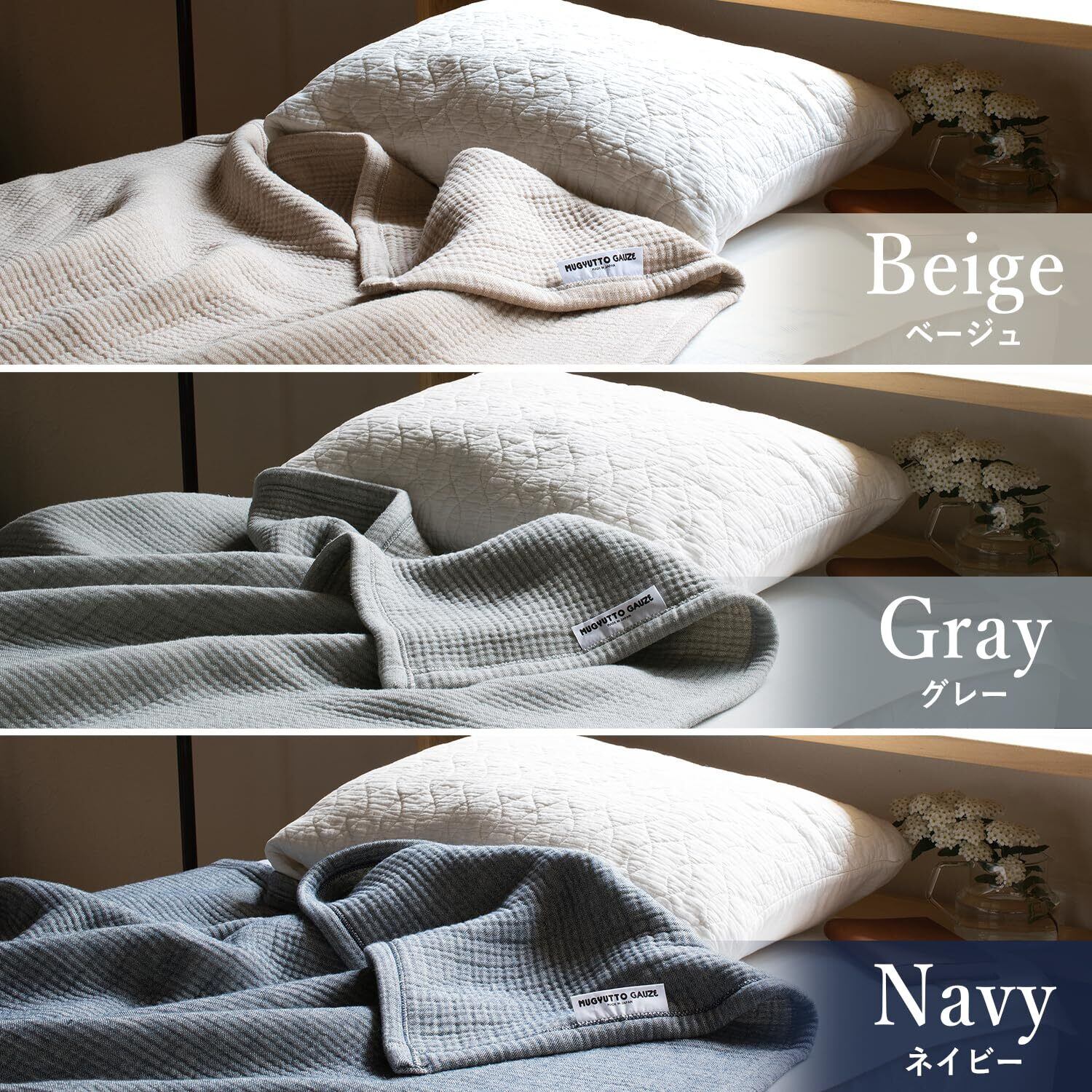 触った瞬間、「むぎゅっ」と音が聞こえてきそうな厚みのある立体的なガーゼケット「MUGYUTTO GAUZE」。 その秘密は中間層に織り交ぜられたインナーパイル。 パイル部分にはウールを使用することで、よりふっくらとした触り心地に仕上げられています。 また、コットンとウールを織り交ぜて使用することで、吸湿性と保温性を両立。 季節を問わず使いやすい、万能ガーゼケットです。