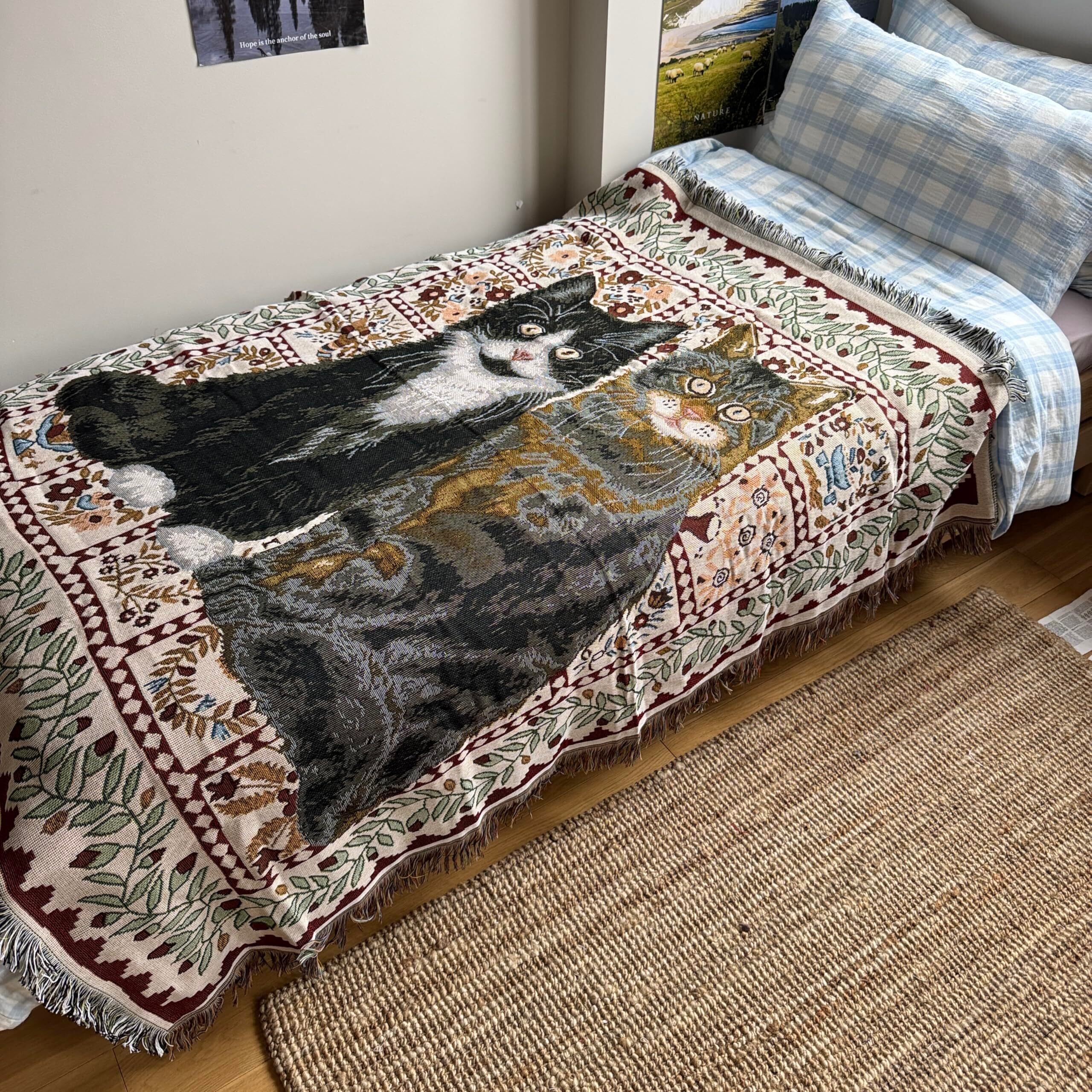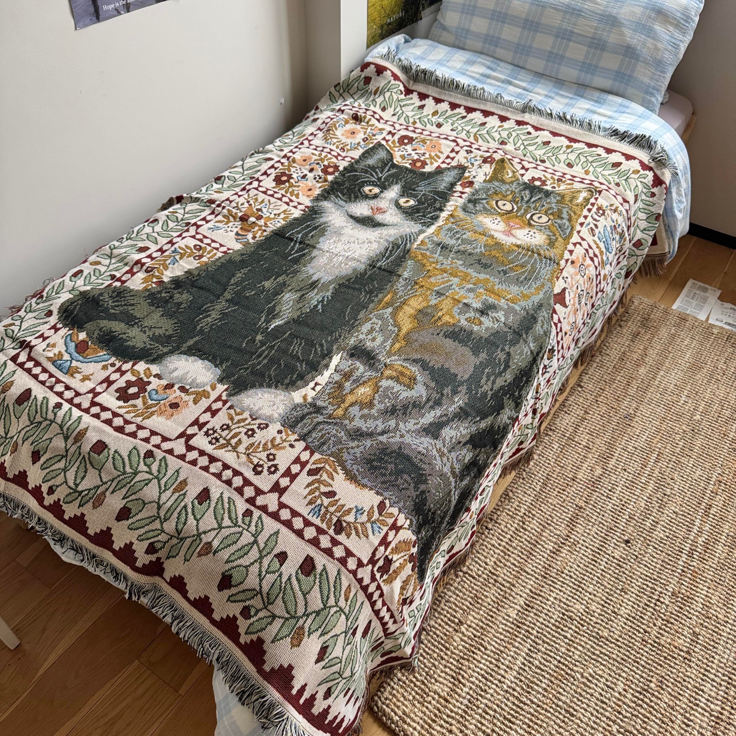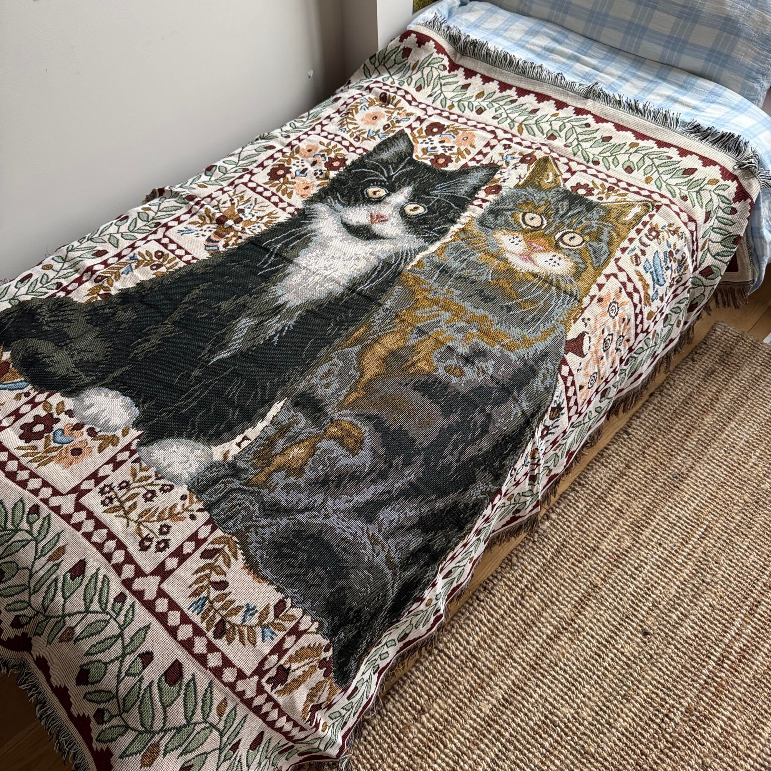 猫柄スローブランケット1枚、ヴィンテージファブリックスリーピングブランケット、ソファ、読書、オフィス用。