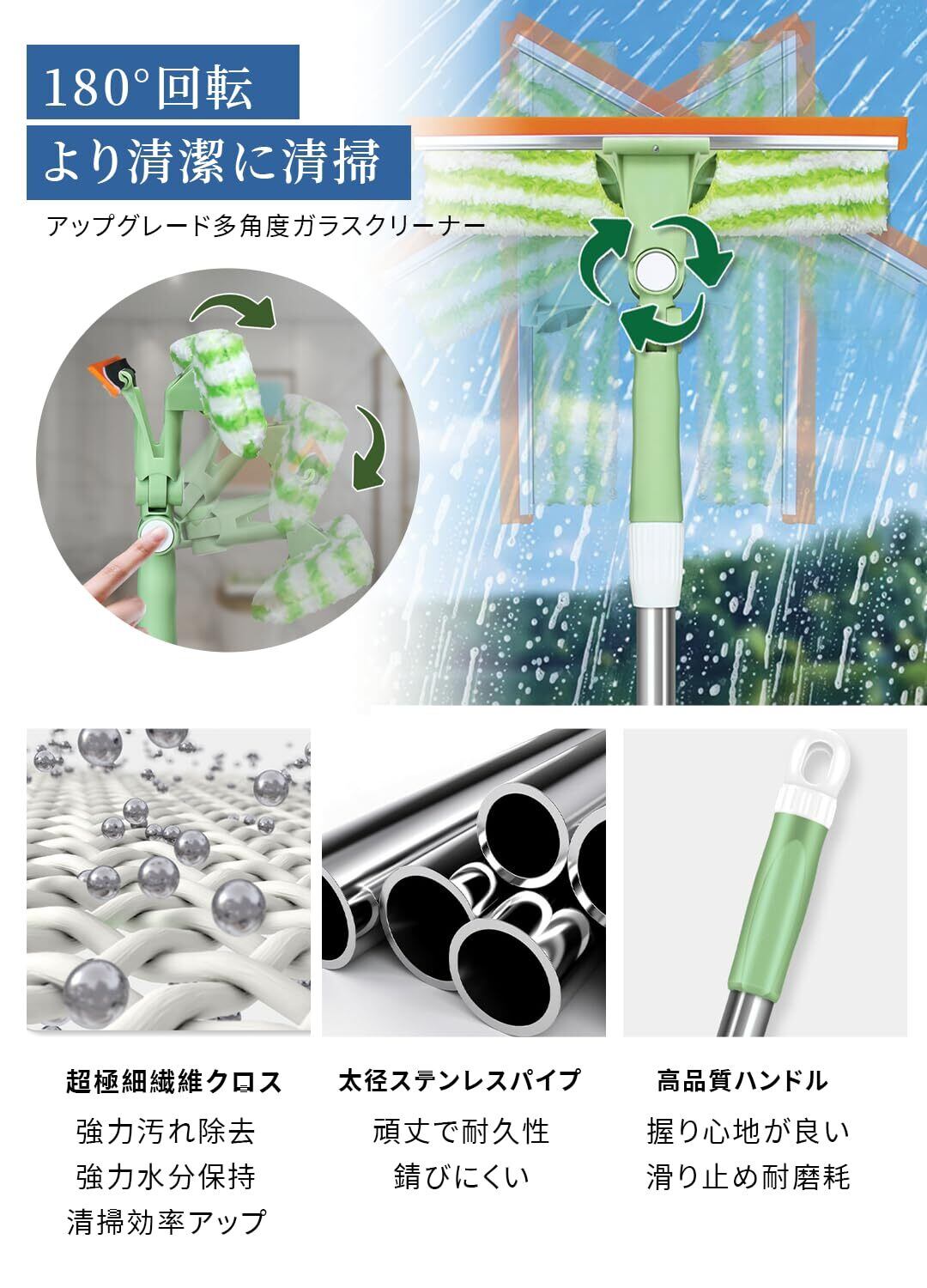 200cm 伸縮加长 + 高所掃除ブラシ対応!最大 200cm まで伸縮可能で脚立不要,高窓・外壁・天井の清掃がラクラク。縮めれば手持ち使用も OK,低所の窓や鏡、浴室の清掃にも一台で対応,家中の高所・低所掃除ニーズを全方位満たす万能窓掃除道具です