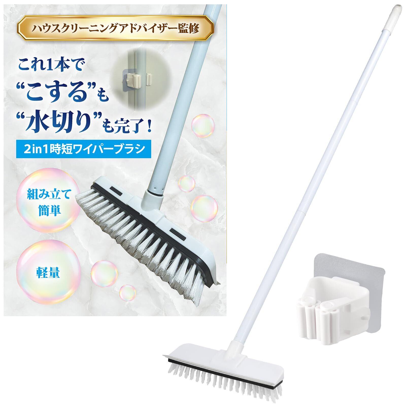 デッキブラシ 【ブラシ&水切り】 2in1 2way 水切り ワイパー モップ 3段階調整 伸縮 床 浴室 お風呂 玄関 ベランダ フローリング 室外 掃除 壁掛け収納 (ホワイト)