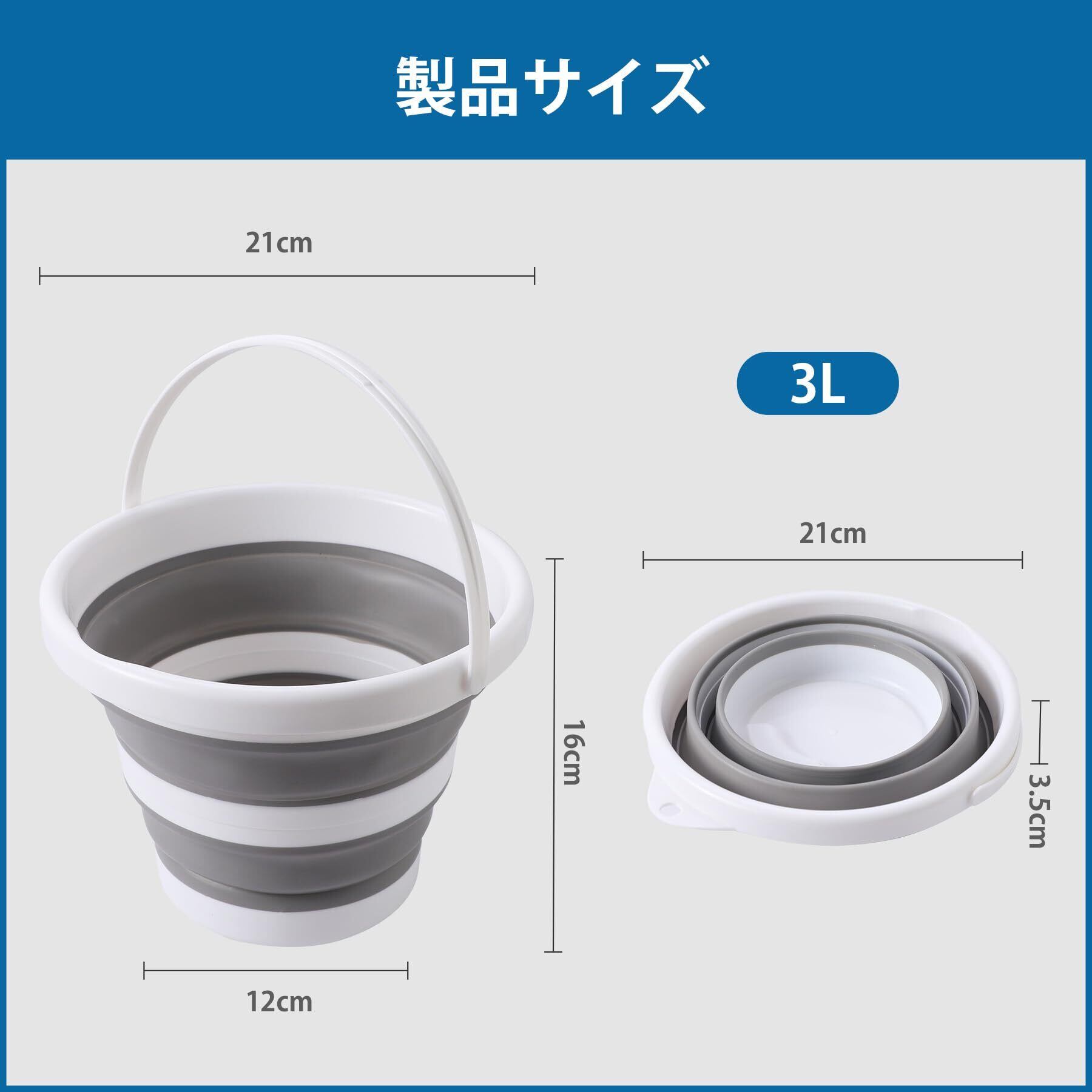 【基本仕様】:(1)3L:サイズ:折りたたみ時(約)長さ21×幅21×高さ3.5cm。 使用時(約)長さ21×幅21×高さ16cm。重さ(約)215g。容量(約)3リットル。(2)5L:サイズ:折りたたみ時(約)長さ25×幅25×高さ4cm。 使用時(約)長さ25×幅25×高さ19cm。重さ(約)300g。容量(約)5リットル。(3)10L:サイズ:折りたたみ時(約)長さ31×幅31×高さ5cm。 使用時(約)長さ31×幅31×高さ24cm。重さ(約)450g。容量(約)10リットル。材質:PP+TPR。