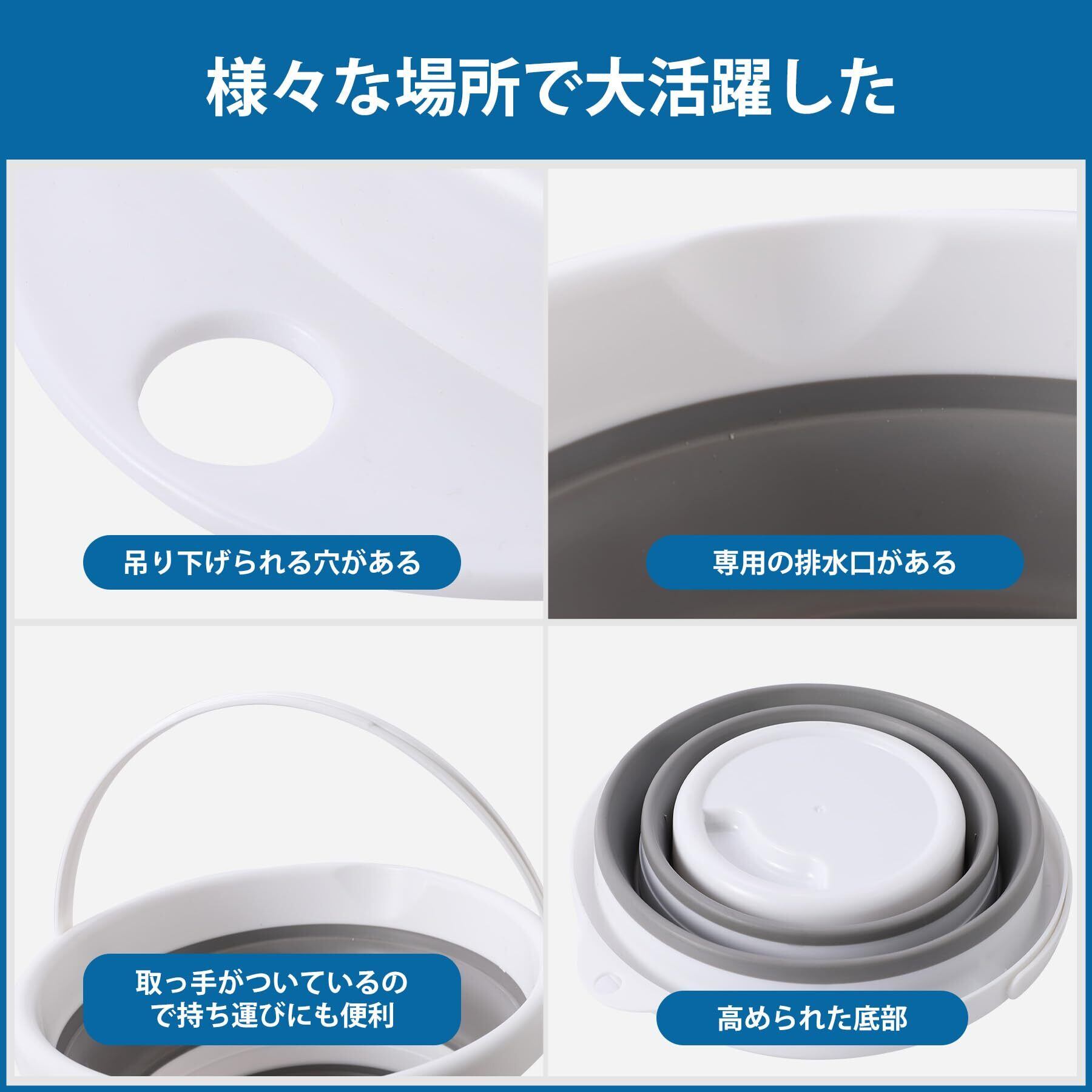【実用的な】:取っ手がついているので持ち運びにも便利です。底部に凹槽があり、持ち運びに便利です。この折りたたみバケツは、専用の出水口が付いているので、水をこぼさずに簡単に注ぐことができます。キャンプやガーデニングに最適です。折りたたむと非常に小さくなるため、収納や持ち運びに最適です。