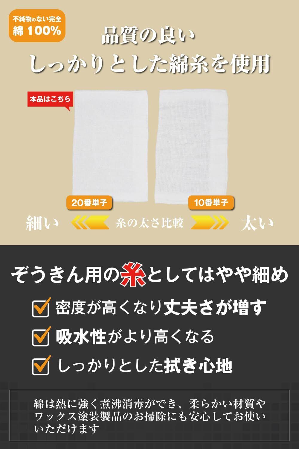 【綿100%の高品質ぞうきん】 精練漂白で不純物を取り除いた綿100%タオル生地を使用。やや細めの糸で丈夫に織り上げ、吸水性も高く、しっかりとした拭き心地が特徴です。